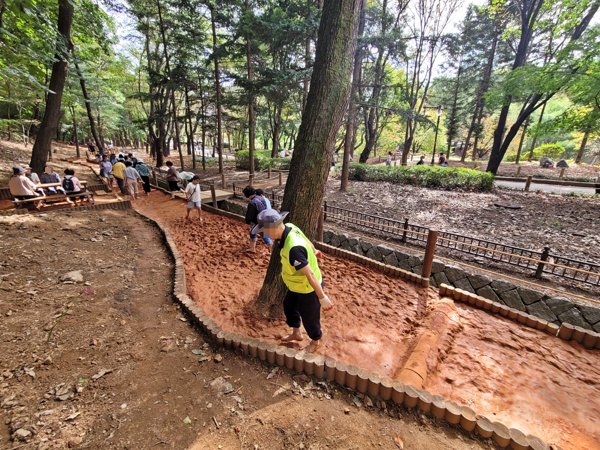 황톳길은 맨발로 다니기 때문에 관리가 중요하죠. 유리 파편 등이 있으면 건강을 생각하려다 다칠 수 있으니까요. 제가 걸어보니 공원 관리하는 직원이 오물 등을 주우며 황톳길 안전을 살피고 있었습니다.