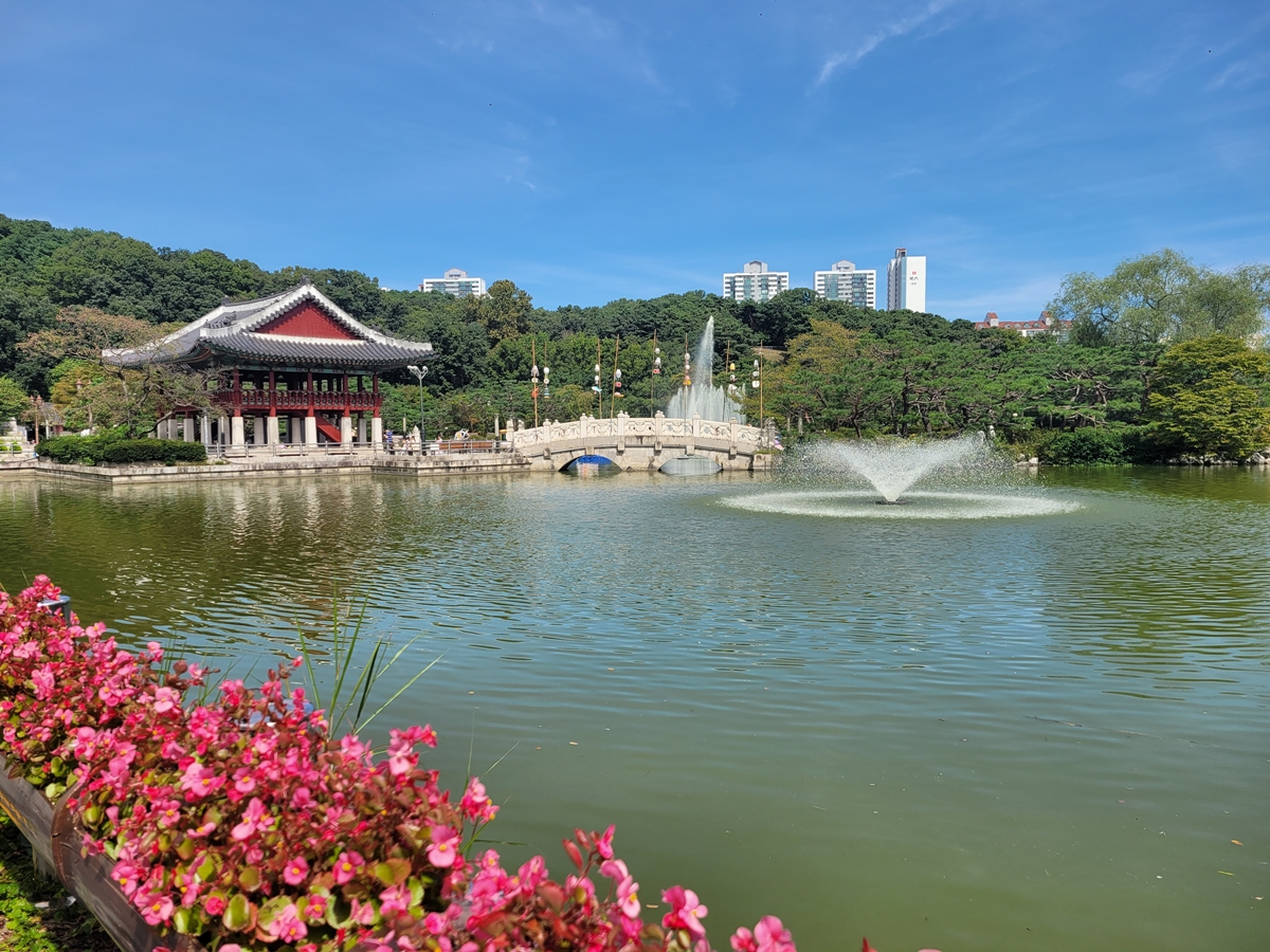 분당중앙공원은 성남 시민뿐만 아니라 경기도민의 쉼터이나 휴식처로 인기가 많은 공원입니다. 돌마각은 서울 경복궁의 경회루를 모티브로 만든 것이라고 하는데요, 호수가 주변에 가을꽃이 있고, 분수가 시원하게 뿜어져 나오고 있습니다.