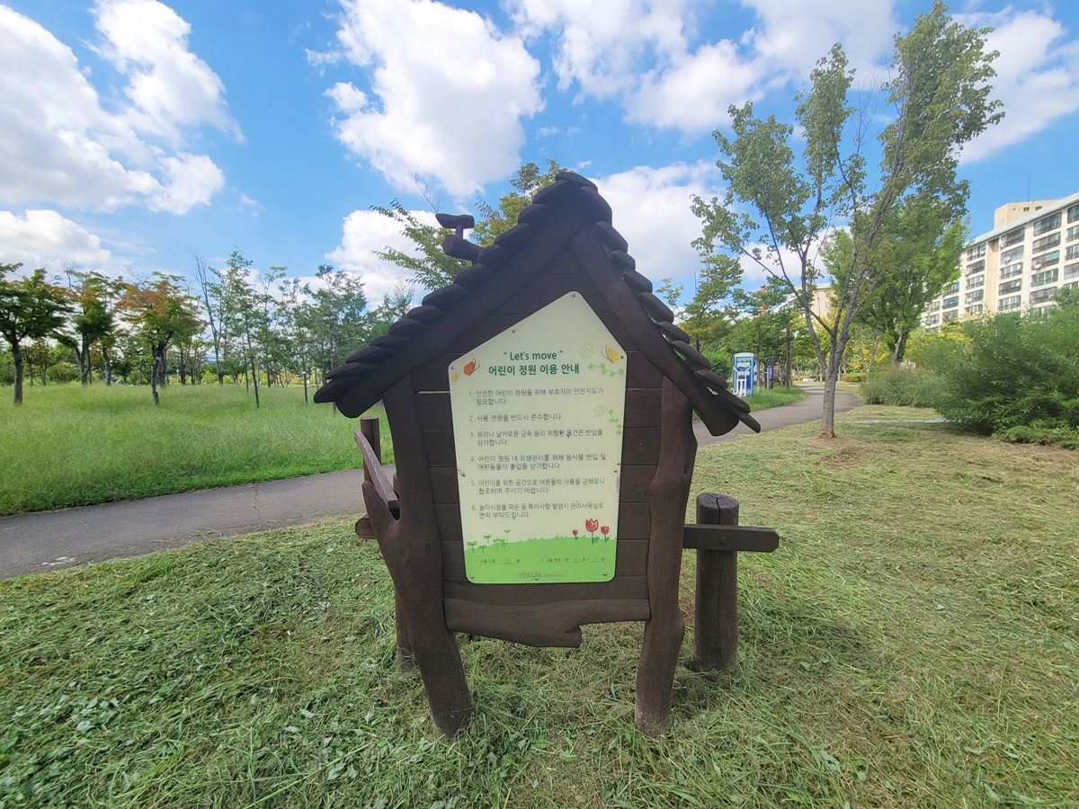 청소년문화공원 안에 어린이정원이 있습니다. 만 3세~7세까지의 아이들이 뛰놀 수 있는 놀이시설이 있는데요, 안전한 놀이를 위해 보호자의 안전 지도가 필요합니다. 안내판을 보니 어린이를 위한 공간이라 어른들의 사용은 금지합니다.