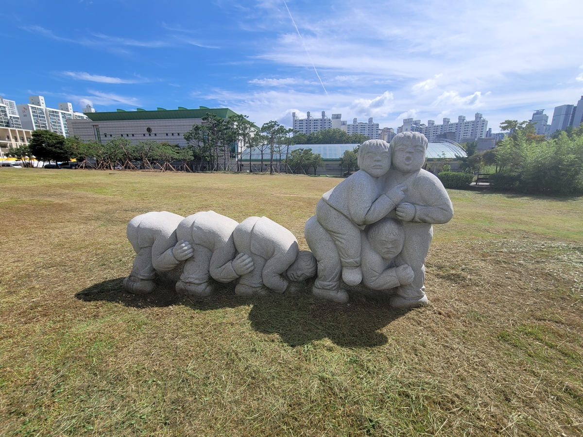 어린이공원에 있는 재미있는 조각상인데요, 광주리에 과일을 지고 등에는 아이를 업은 엄마, 강강술래, 말뚝박기 등의 조각 앞에서 포토존으로도 인기가 많겠네요. 말뚝박기는 한국의 전통 놀이인데요, 제가 어릴 때만 해도 많이 하고 놀았죠. 조각상을 자세히 보니 힘들어하는 표정 등이 아주 익살스럽고 재미있습니다.