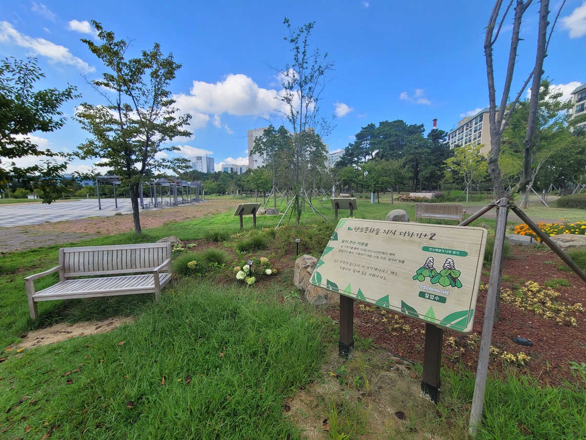 청소년문화공원에 탄소문화숲이 있는데요, 노령화된 숲은 가꾸고 젊은 숲을 만들어서 탄소중립에 기여하기 위한 숲입니다. 탄소중립은 탄소를 배출한 만큼 흡수해서 대기 중 탄소량을 ‘0’으로 만드는 거죠. 기후위기로 탄소 줄이기에 세계가 노력하고 있는데요, 청소년들에게 탄소 줄이기를 실천하는 방법을 배우게 하는 숲입니다.