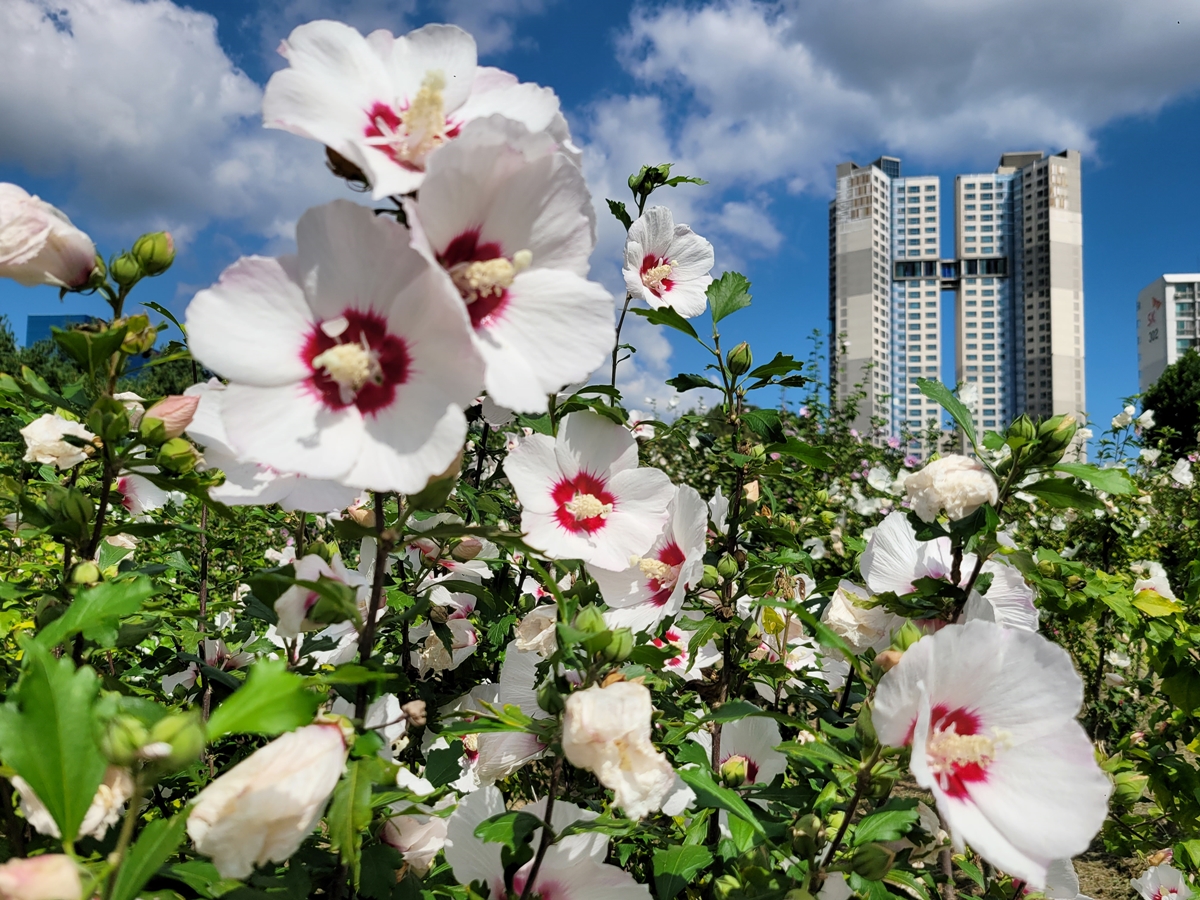 무궁화동산에는 무궁화꽃이 피어 있습니다. 무궁화는 우리나라 국화(國花)죠. 안내판을 보니 예로부터 우리나라를 무궁화가 많은 곳이라 뜻으로 근역(槿域) 또는 근화향(槿花鄕)이라고 하였답니다. 우리나라 애국가에도 ‘무궁화 삼천리 화려강산’이라고 나오죠. 무궁화는 우리나라 국민성과 순결, 강인함을 상징한다고 합니다.