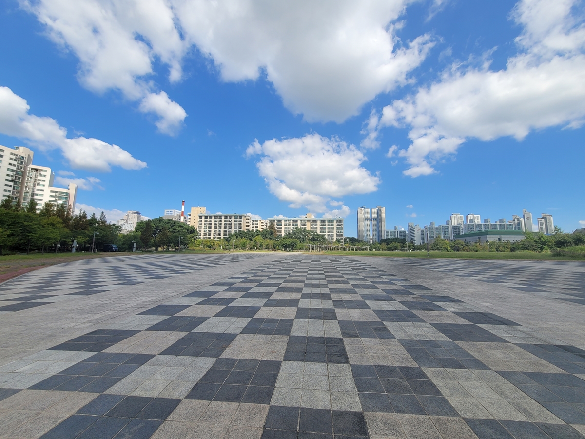 먼저 소광장입니다. 광장에 파고라 시설이 있고요, 파란 가을하늘에 뭉게구름이 두둥실 떠다니고 있습니다. 광장에 있는 바닥 분수대는 여름에 아이들이 신나게 물놀이를 즐기던 곳이죠. 내년 여름을 기약하며 운영을 멈추었습니다.