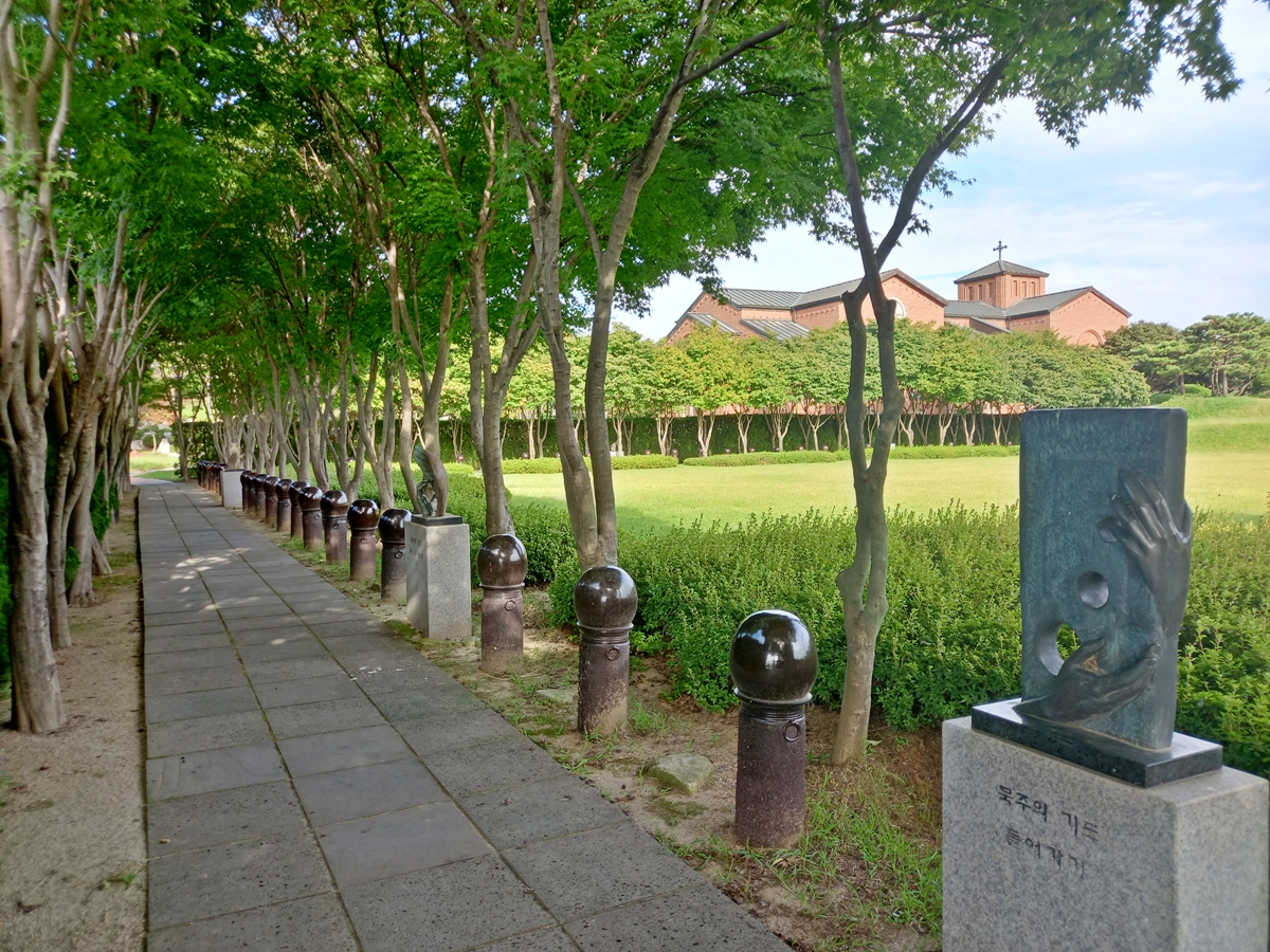 주차장에서 계단을 따라 올라가면 묵주의 기도 길이 나옵니다. 묵주(默珠)는 천주교에서 기도할 때 사용하는 도구입니다. 신자들이 묵주를 들고 기도하는 길인데요, 길에 묵주를 닮은 둥그런 돌이 세워져 있습니다.