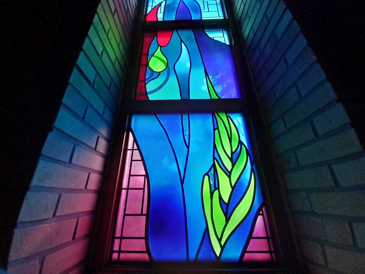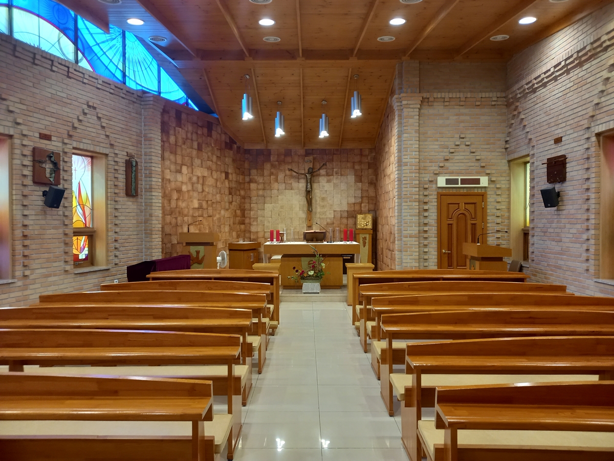 내부를 보니 우리 고유의 한옥 느낌입니다. 천장과 벽을 보면 마치 한옥에 들어온 듯합니다. 벽에는 스테인드글라스가 있고요, 그 창으로 빛이 들어와 아주 예뻤습니다. 저는 아내와 함께 갔는데요, 천주교 신자라 둘이 조용히 기도를 드렸습니다.