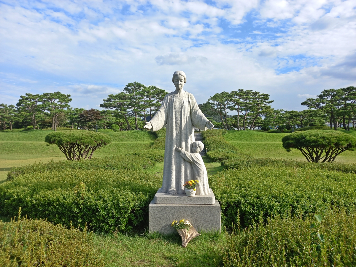 화성시 남양성모성지에서 본 성모마리아와 비슷한 모습입니다. 아이가 성모마리아 치마폭을 붙잡고 있고요, 그 앞에 국화꽃이 놓여 있습니다. 마치 어릴적 어머니 모습을 보는 듯 하고, 왠지 마음이 푸근해집니다.