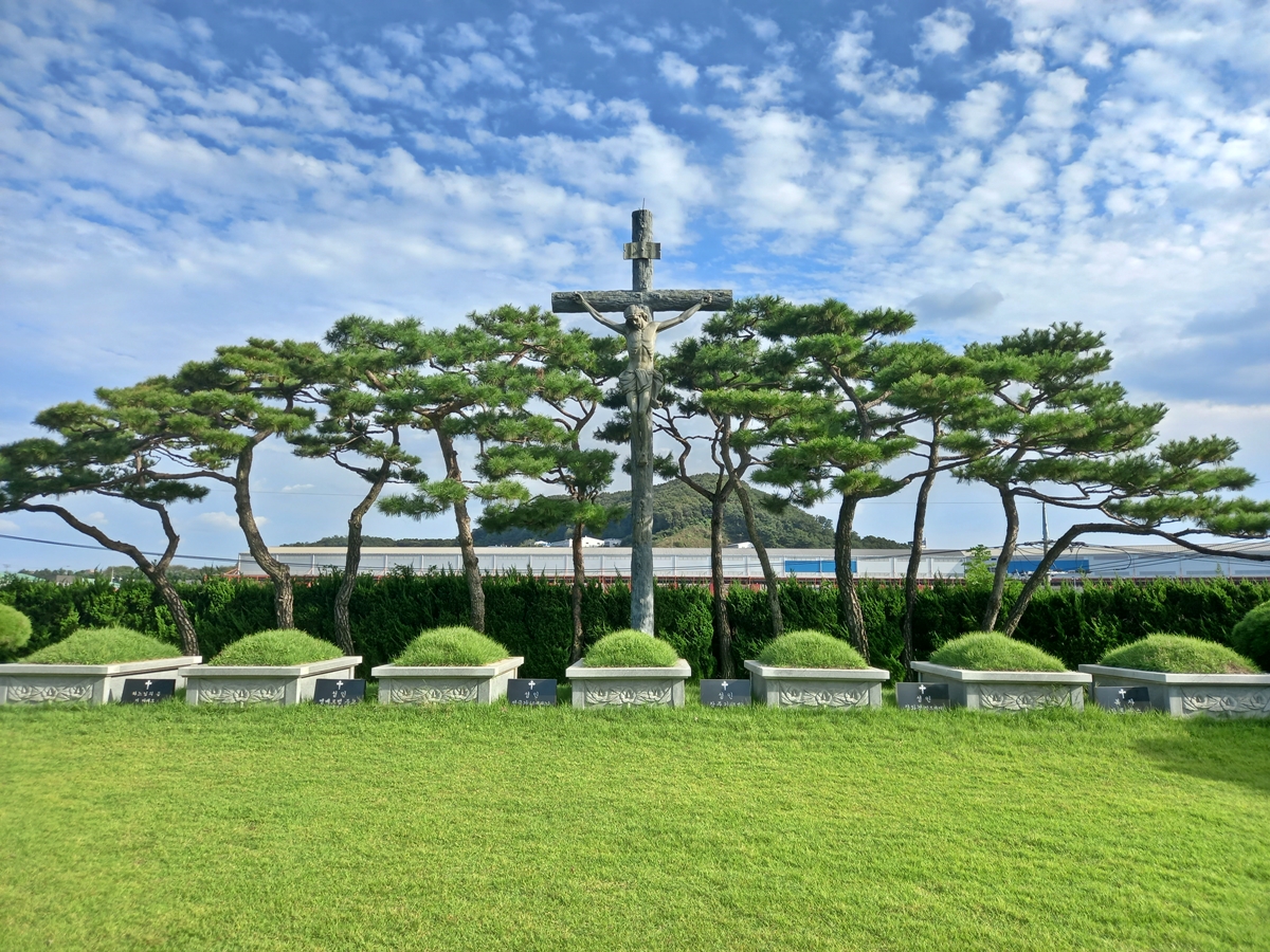 대형십자가 앞에 성인 묘지가 있습니다. 십자가 뒤로는 소나무가 병풍처럼 둘러 있는 것이 인상 깊습니다. 성인 묘지는 입 곱 기가 나란히 있습니다. 소나무와 어우러진 십자가가 너무 아름다워 묘지라는 느낌은 들지 않았습니다.