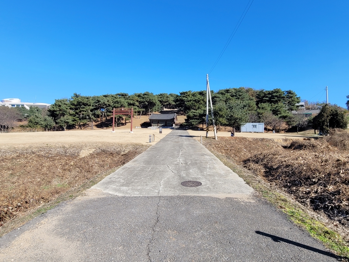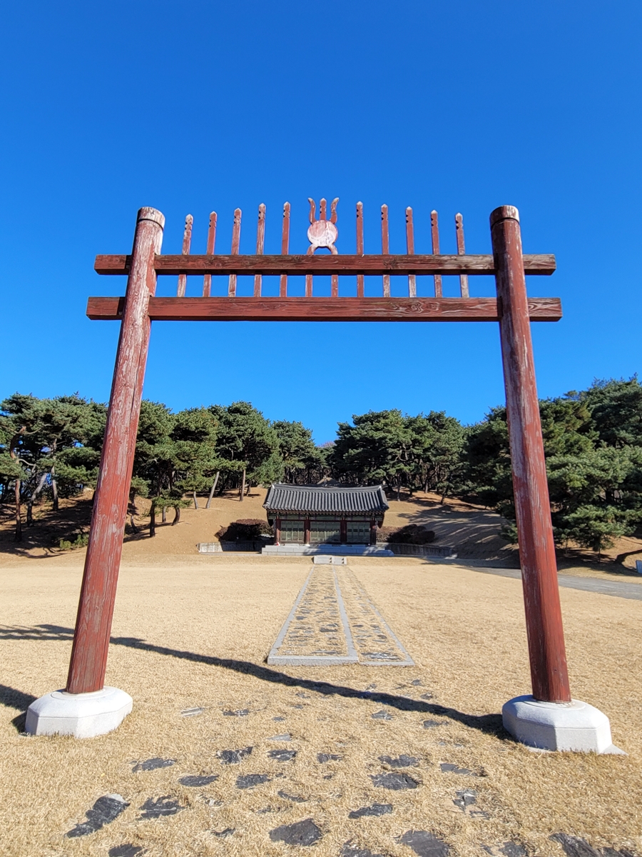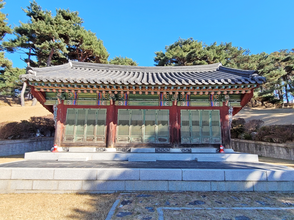 표지석 옆에 제사를 지내는 전각이 있습니다. 문이 잠겨 있어 안은 볼 수 없었지만, 왕릉에서 봤던 제향 공간처럼 정갈한 공간입니다. 홍살문과 제향 공간 등은 비교적 최근에 세운 것으로, 애초에 묘역은 봉분과 석물, 신도비만 있었다고 합니다.
