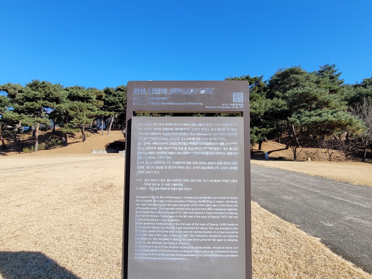 신빈 김 씨는 세종대왕이 승하한 후 불가에 귀의해 59세로 생을 마쳤습니다. 조선시대 후궁 중 많은 여인이 승은을 입고 하루아침에 출세했지만요, 신빈 김 씨처럼 최고 품계인 정1품까지 오른 인물은 그리 많지 않습니다. 경기도 화성시에 방문할 기회가 있다면 조선판 신데렐라 신빈 김 씨 묘역을 꼭 한번 방문해보시기를 바랍니다.