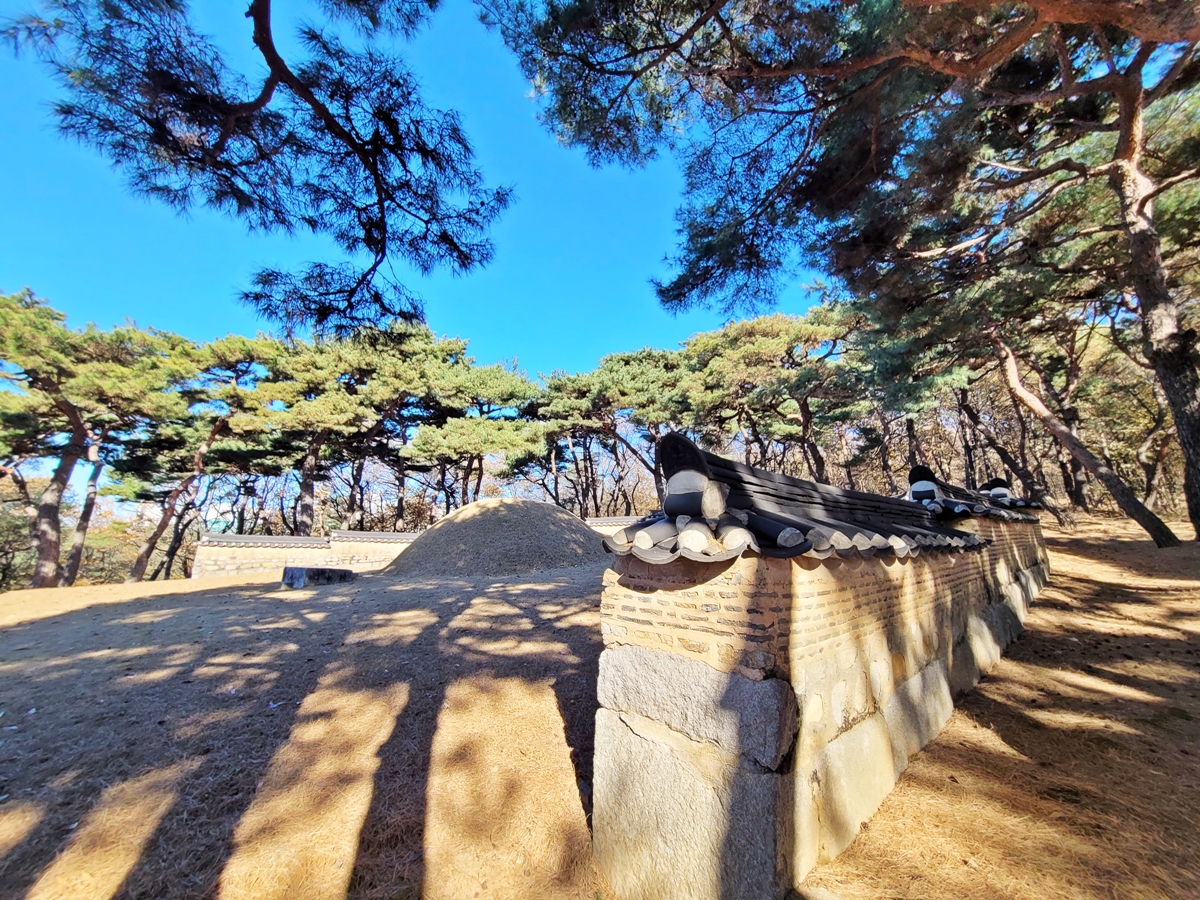 제향 공간을 지나면 소나무 숲이 감싸고 있는 신빈 김 씨 묘가 있습니다. 봉분을 중심으로 넓은 곡장(曲墻)과 함께 봉분의 중앙에 상석과 향로석, 장명등이 있습니다. 좌우에 문인석 1쌍까지 세워져 있습니다. 규모로 보면 왕릉 못지않습니다.