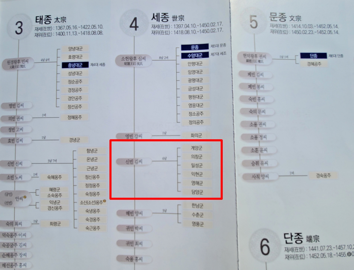 왕실 계보를 보면 세종대왕(1397~1450)은 왕후 소헌왕후 심 씨 외에도 많은 후궁을 두었습니다. 그중의 한 명이 신빈 김 씨입니다. 김 씨는 궁에서 사용하는 물품을 공급하는 관청인 내자시(內資寺, 호조에 속한 관서)의 여종이었습니다.