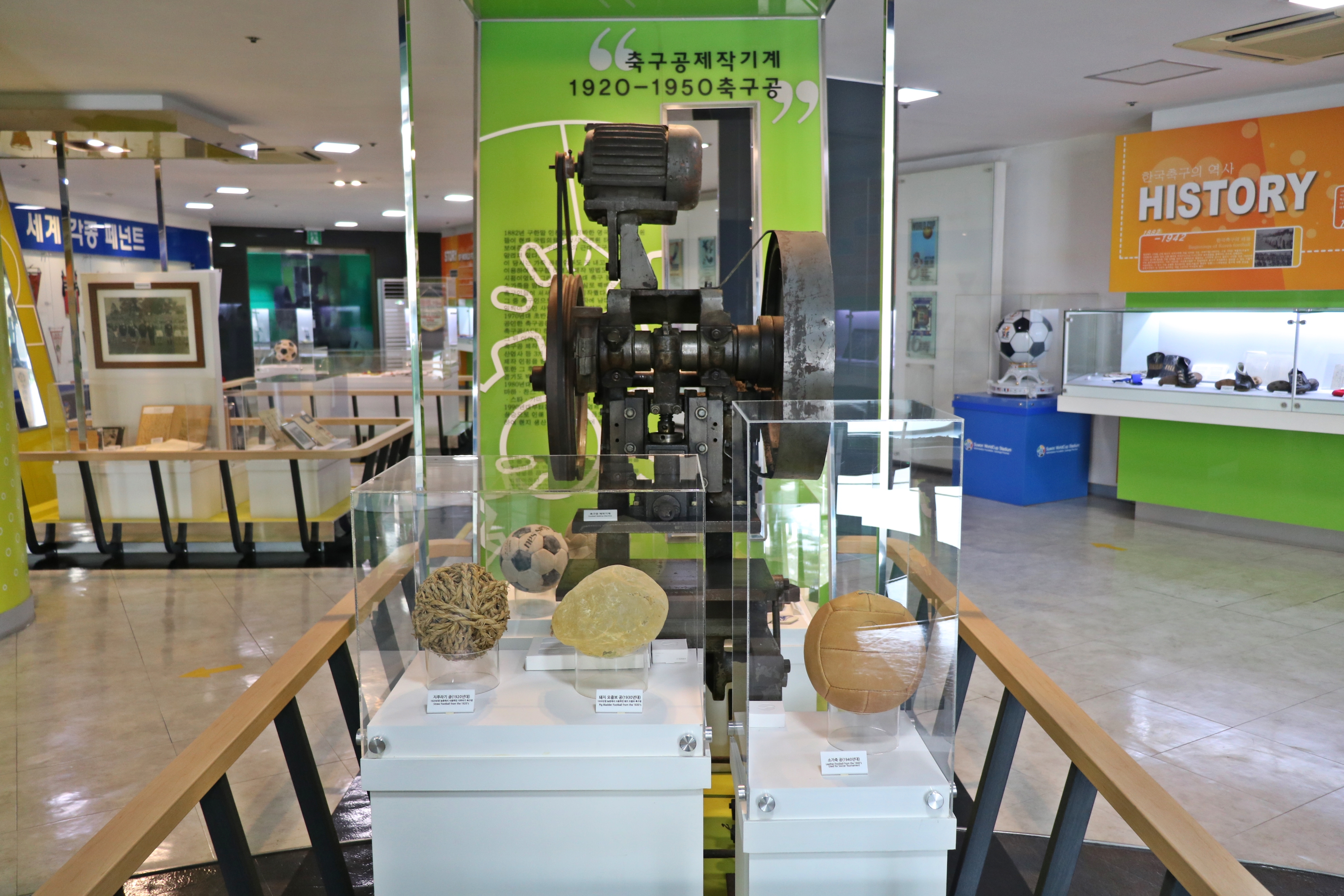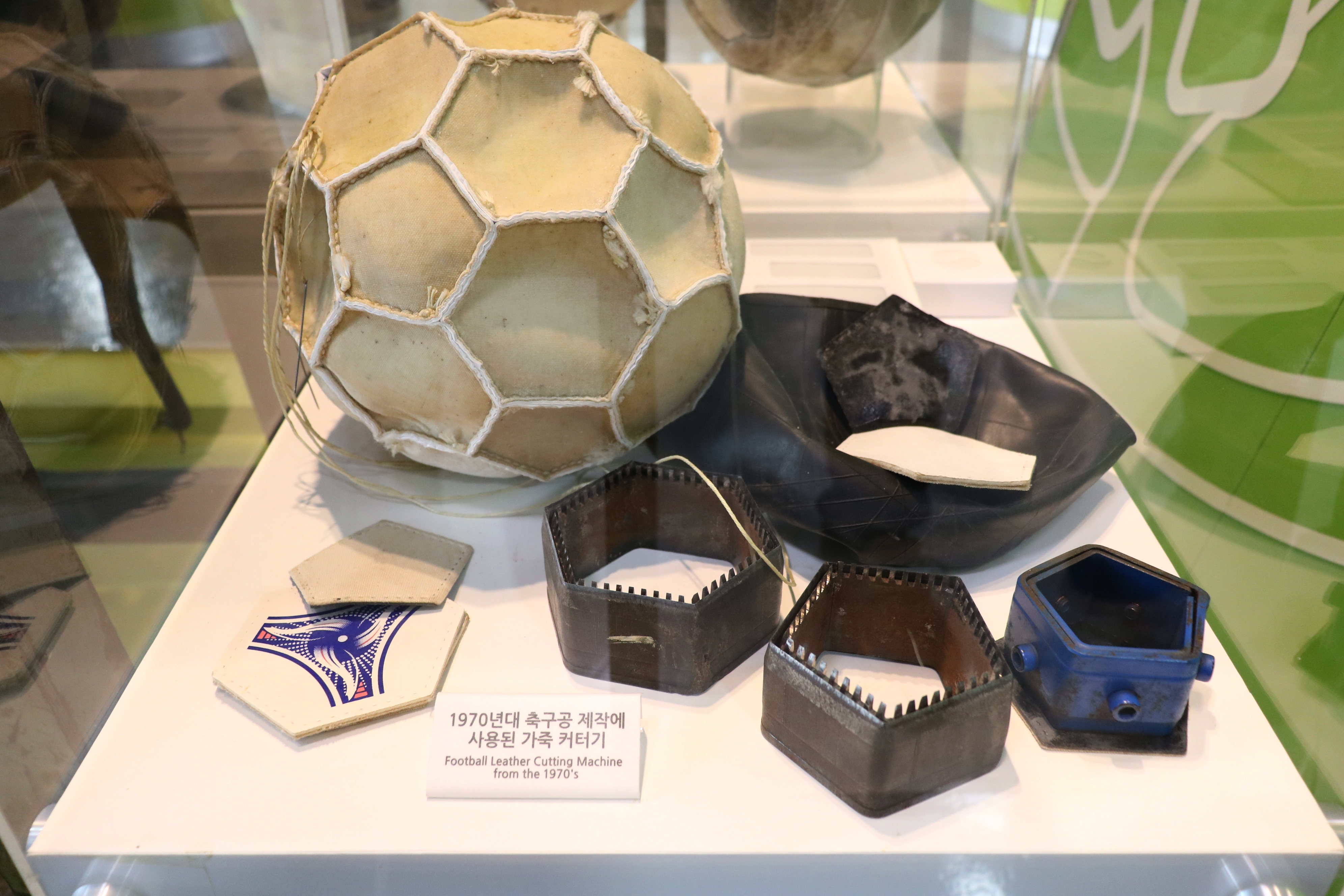 축구공은 어떻게 만들까요? 1970년대 축구공 만들 때 사용하던 가죽 커터기가 있습니다. 축구공 역사에 대한 것을 알 수 있었습니다.