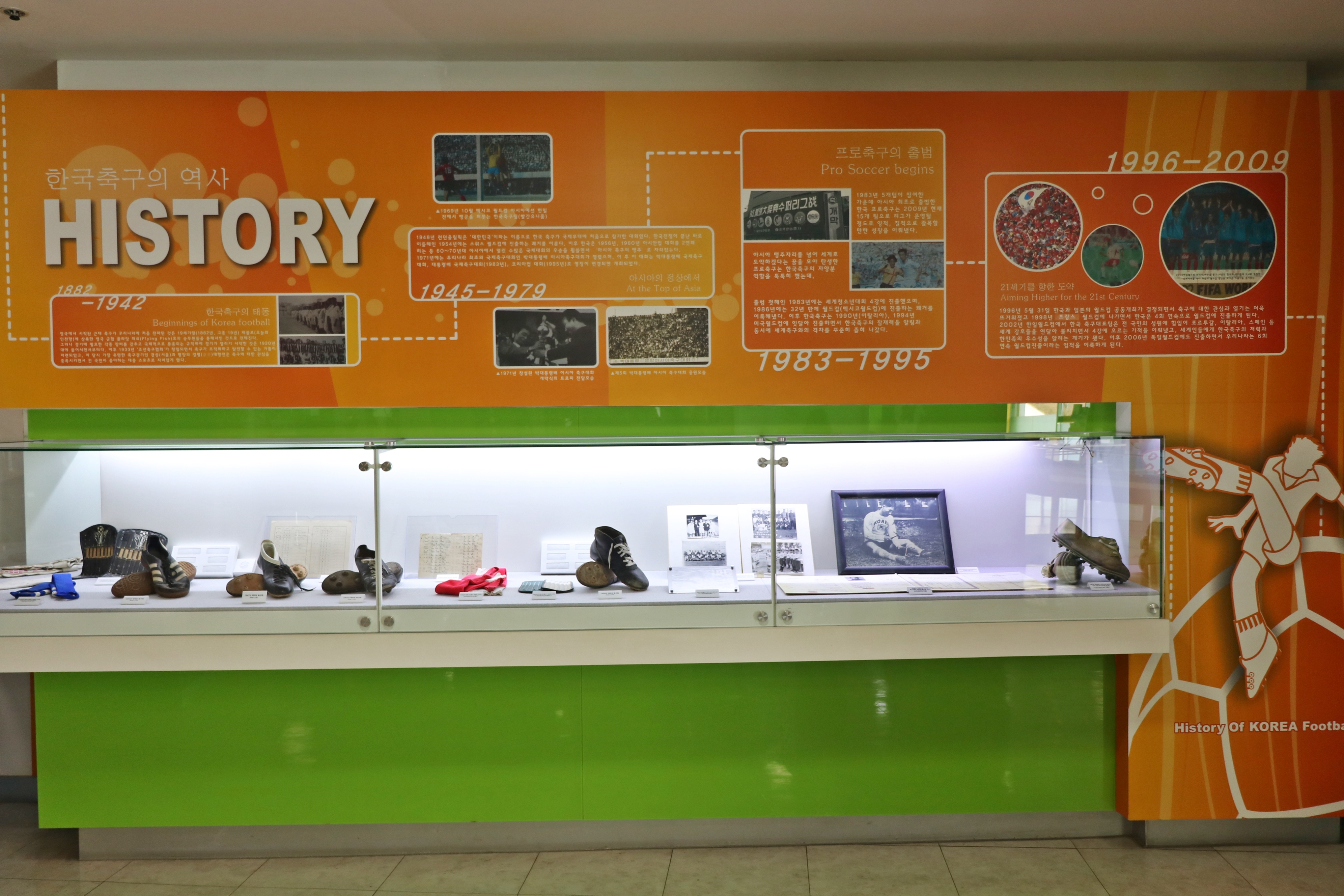 축구역사관은 한국 축구 역사를 자세하게 설명하고 있습니다. 영국에서 시작된 근대 축구가 우리나라에 처음 전파된 것은 19세기 말(1882년, 고종 19년) 제물포(오늘의 인천항)에 상륙한 영국 군함 플라링 피쉬(Flying Fish)호의 승무원을 통해서라고 합니다. 그 후 스위스 월드컵에 처음 출전하고 2002년에는 월드컵도 개최해 4강 신화를 이루는 등 비약적인 발전을 이뤘죠.