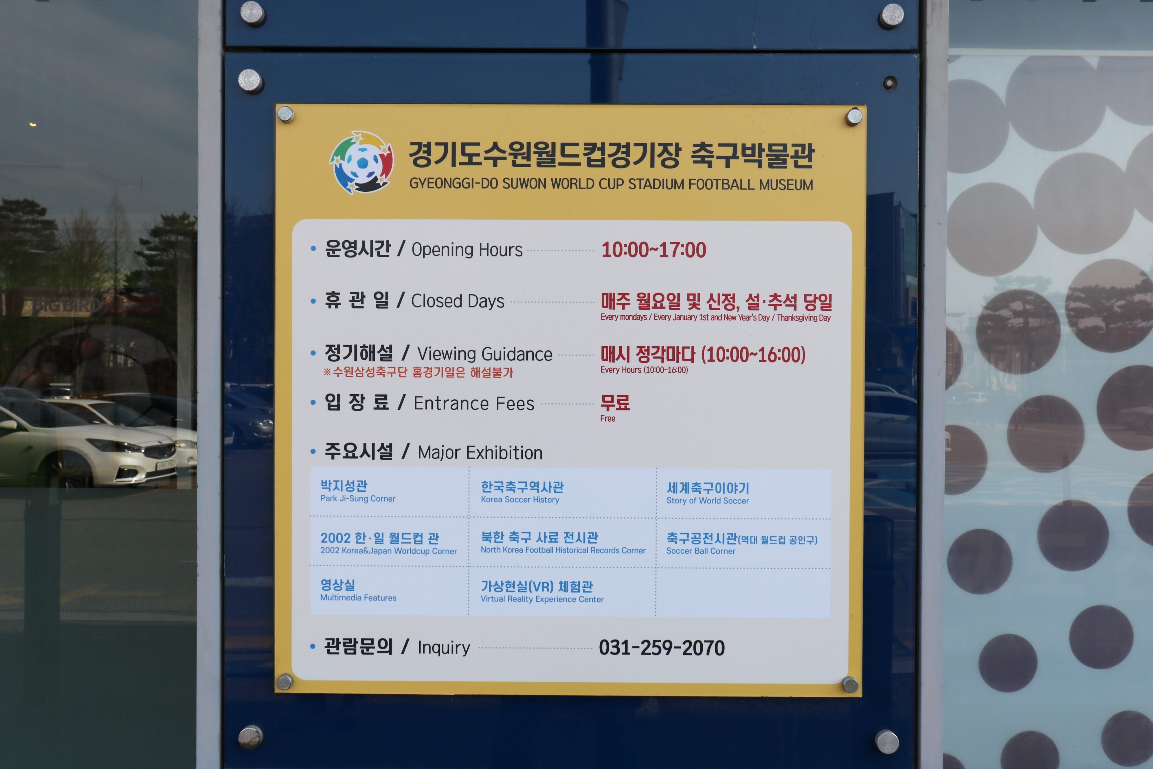 우리나라 축구박물관은 어디에 있을까요? 수원 월드컵경기장 1층에 있습니다. 축구박물관 옆에 월드컵경기장 조각공원이 있어 함께 관람하면 좋습니다. 특히 축구를 좋아하는 아이들과 함께 오면 더 좋겠죠. 축구박물관 운영시간은 위와 같습니다.