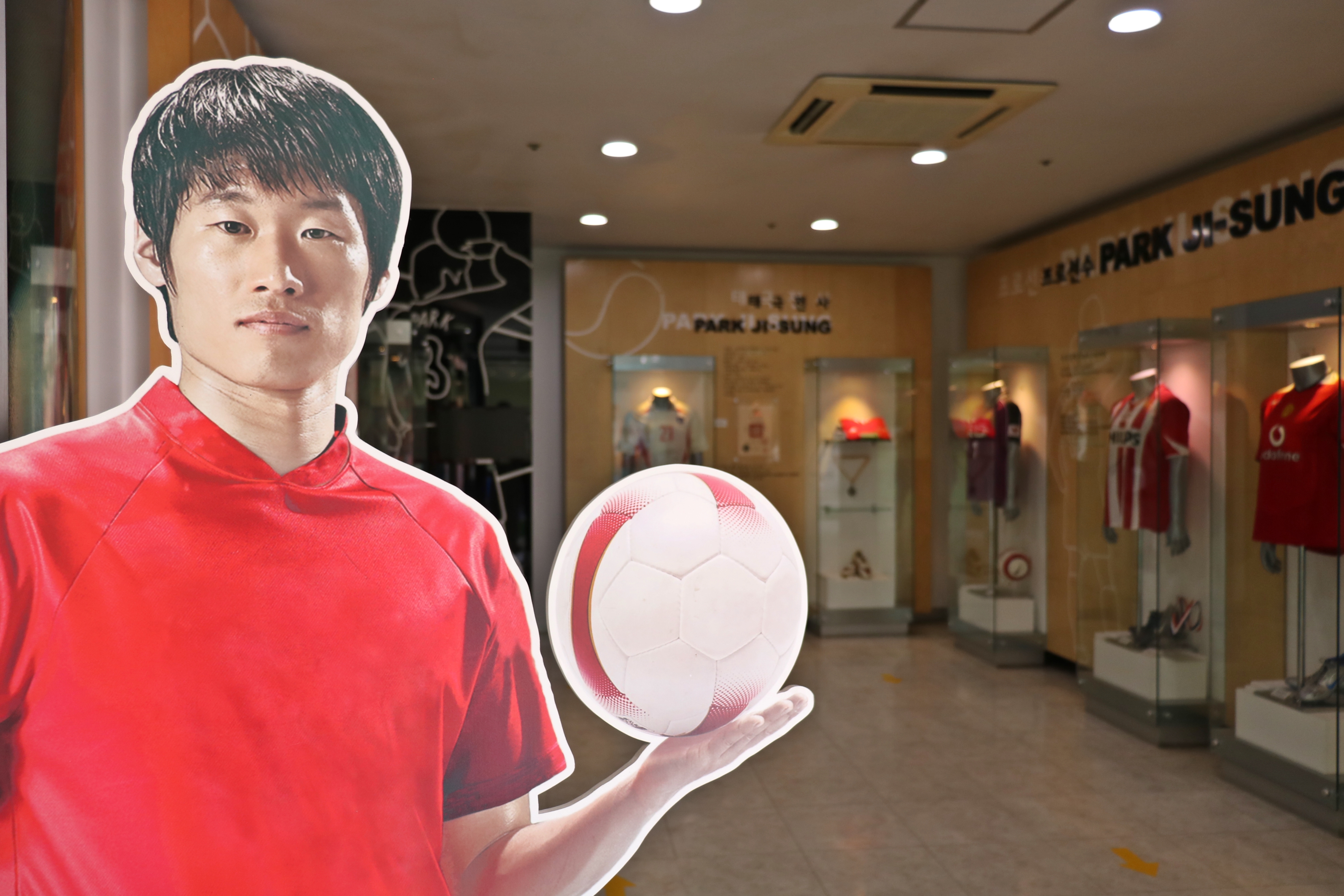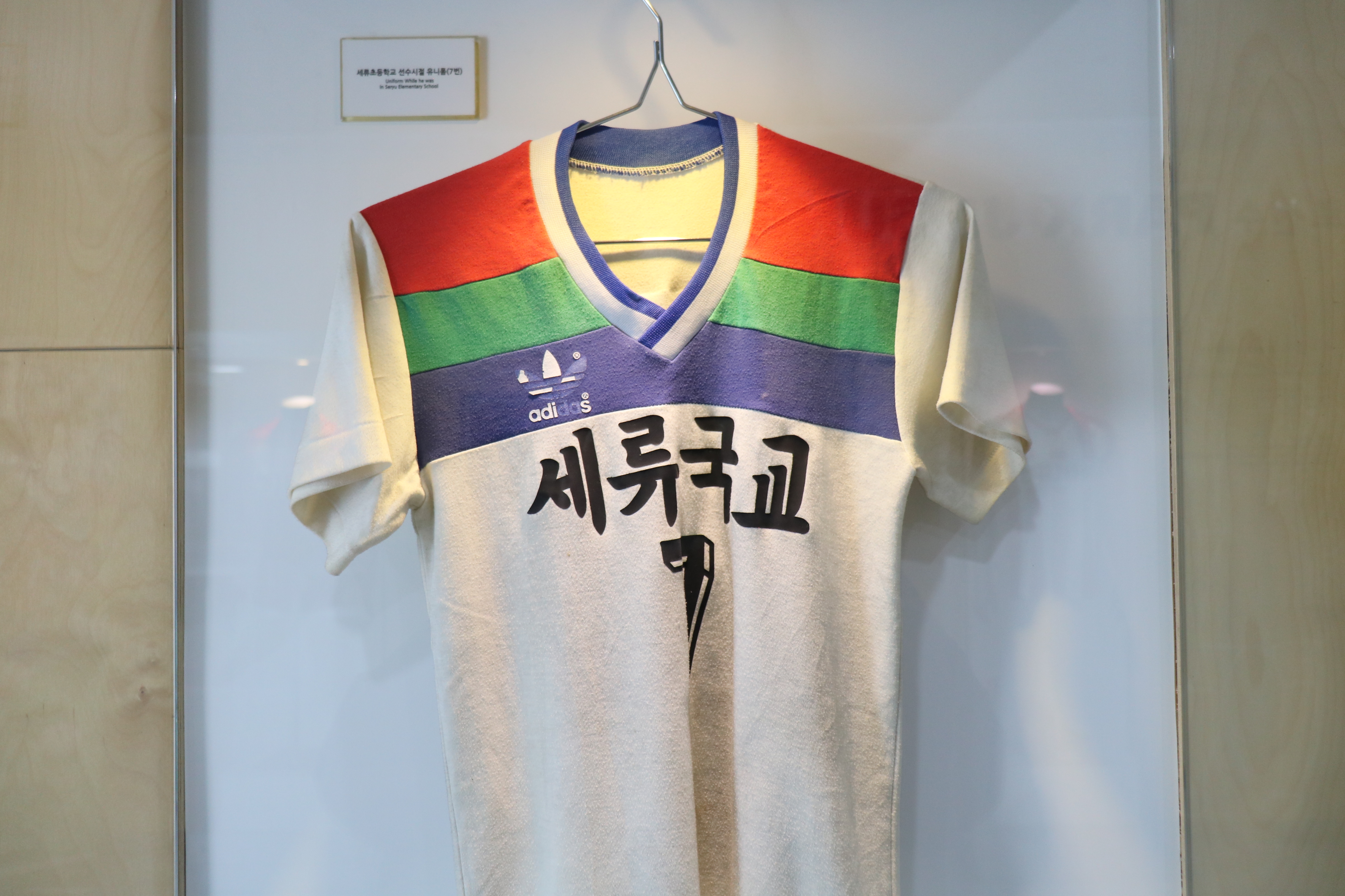 박지성관에는 박 선수가 입었던 유니폼이 전시되고 있습니다. 세류초등학교 때 입었던 유니폼도 있는데요, 그때 등번호가 7번이었네요.