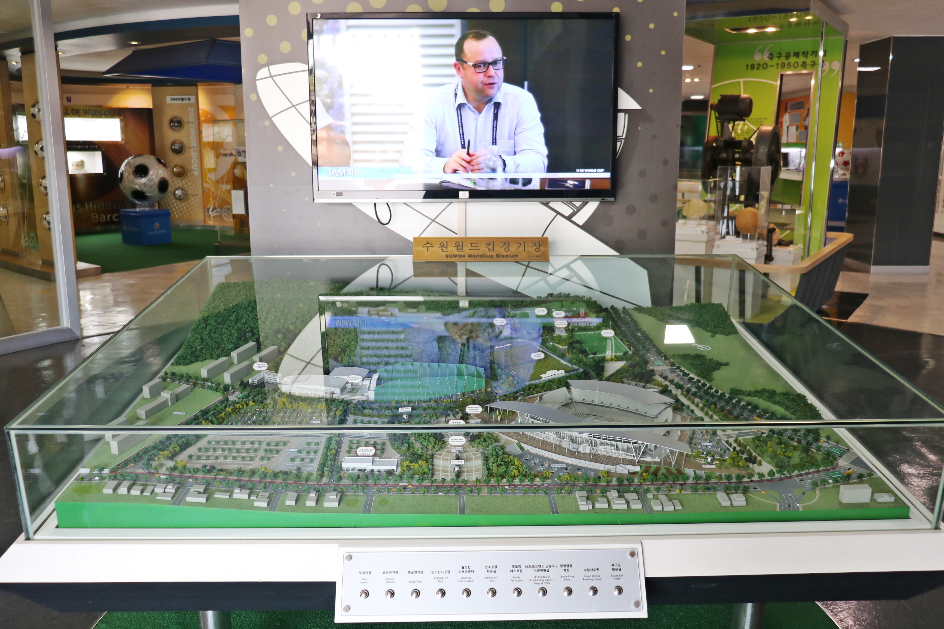 축구박물관 중앙에 수원 월드컵경기장 모형이 있습니다. 하늘에서 본 경기장 모습을 한눈에 볼 수 있습니다. 앞에 버튼을 누르면 해당 건물에 불이 들어와 자세한 위치를 알 수 있습니다. 월드컵경기장 영상도 나오고요.