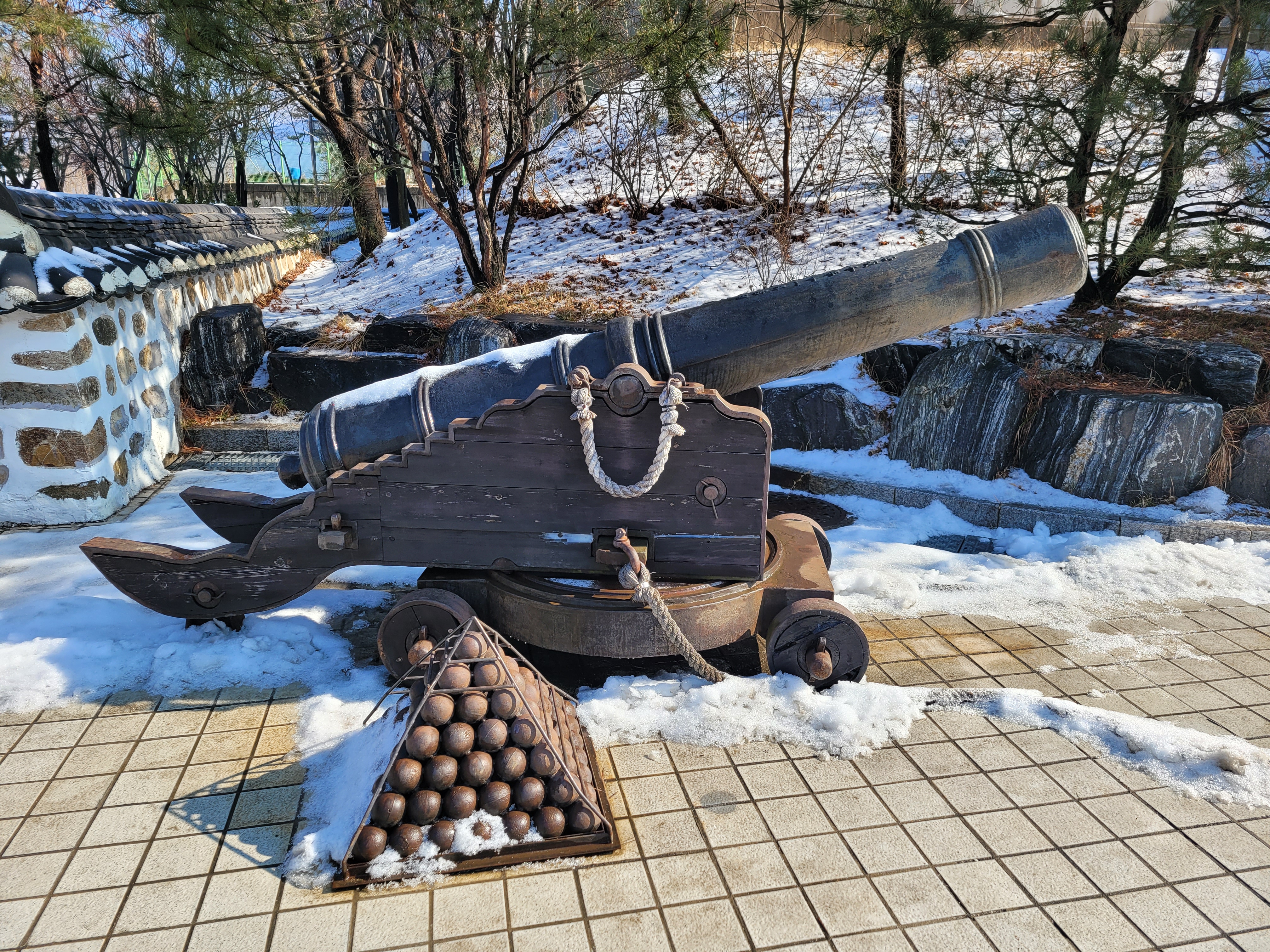 안내판을 보니 여기서 홍이(紅吏)는 ‘붉은 오랑캐’란 뜻인데요, 머리털이 붉은 네덜란드 사람을 지칭하는 말입니다. 홍이포는 16세기 네덜란드 선교사들에 의해 전해진 서양 대포인데요, 전시된 홍이포는 복제품인데, 실제 발사도 가능하다고 합니다.