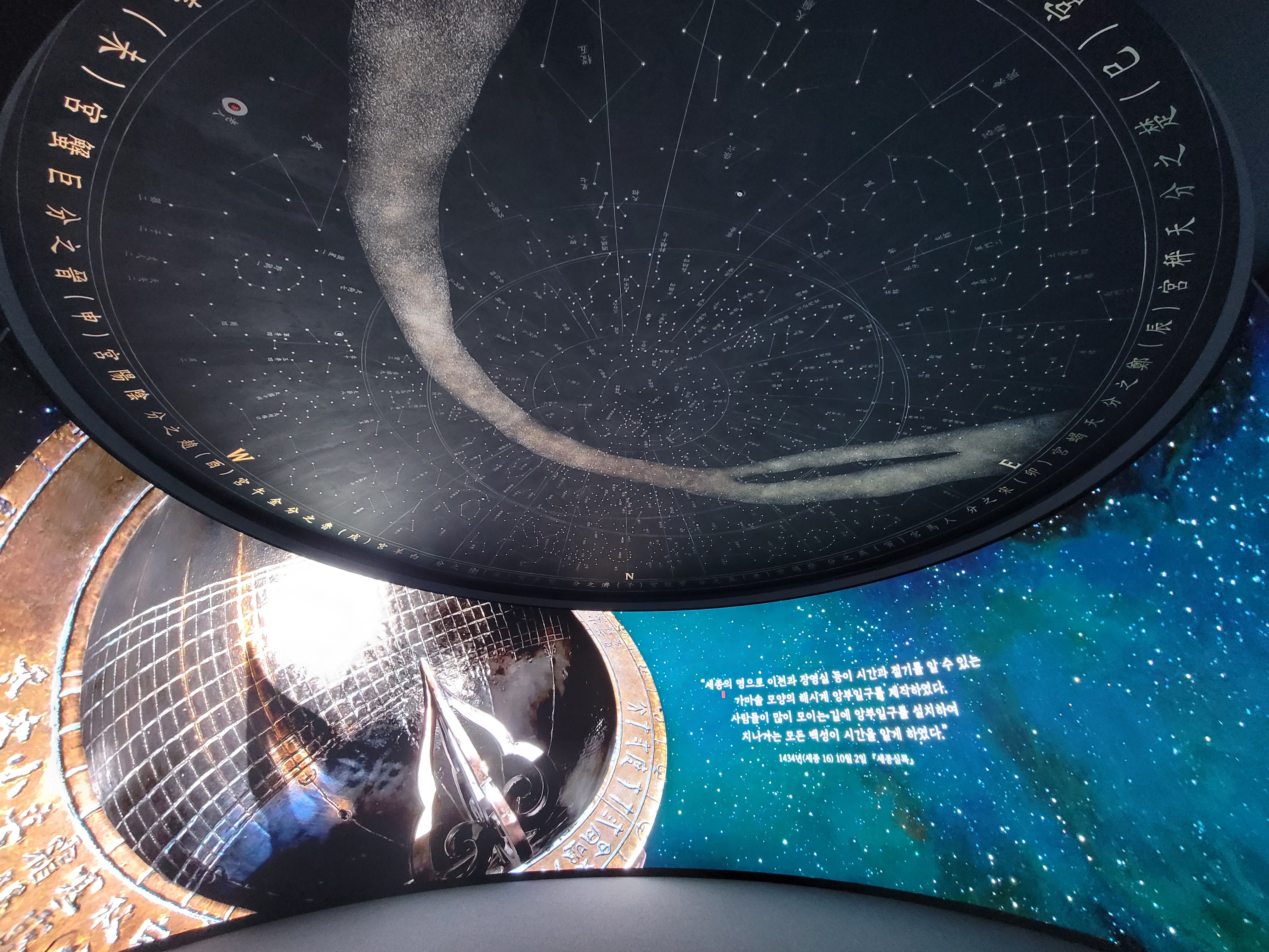 이곳에서 눈길을 끄는 것은 실감 콘텐츠 영상인데요, <1787:스페이스 오디세이>(12분), 한강(3분) 등 두 개의 영상이 상영되고 있습니다. 올해가 갑진년 청룡의 해잖아요. 여기서는 청룡이 아니라 금룡이 나오고 있습니다. 그리고 실학을 과학으로 발전시킨 해시계, 혼천의 등의 영상을 통해 설명되고 있습니다.