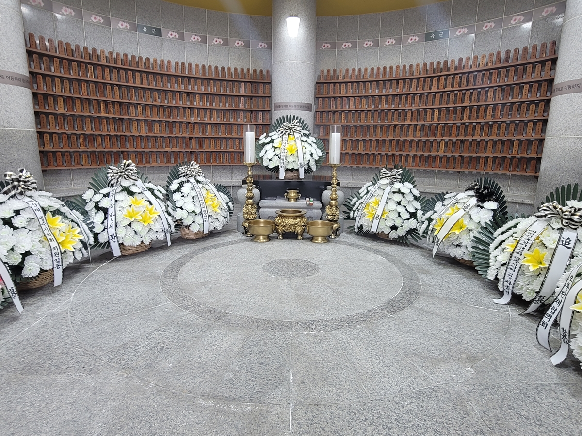 현충탑 아래 참배시설이 있습니다. 출입문 우측에 있는 안내문을 보니 화~토 09:00~17:00까지 개방한다고 합니다. 3·1절을 앞두고 있어서인지 위패를 모신 곳 앞에 조화가 많이 놓여 있습니다. 나는 고개를 숙여 광주 출신 호국영령들에게 감사의 묵념을 올렸습니다.