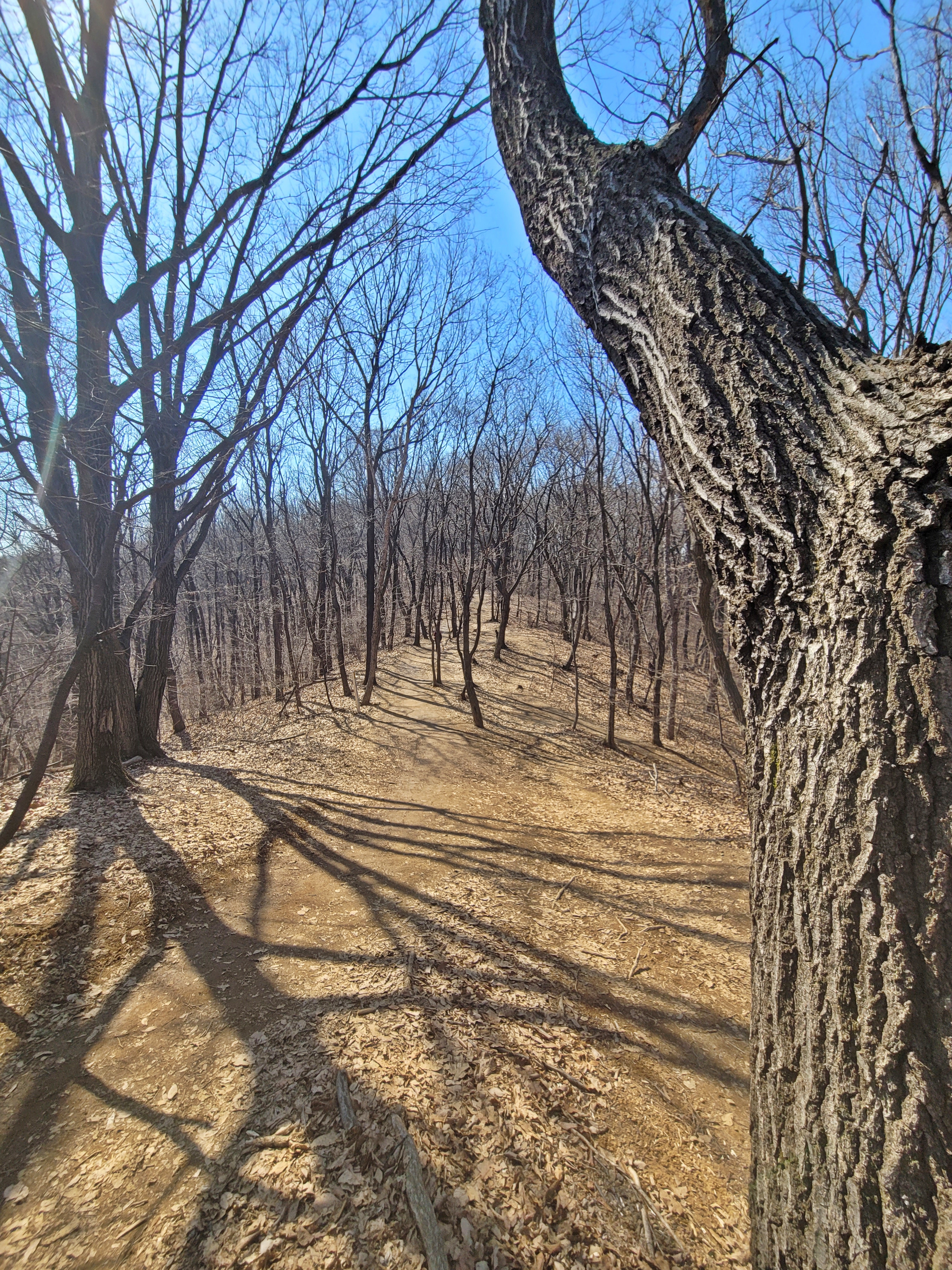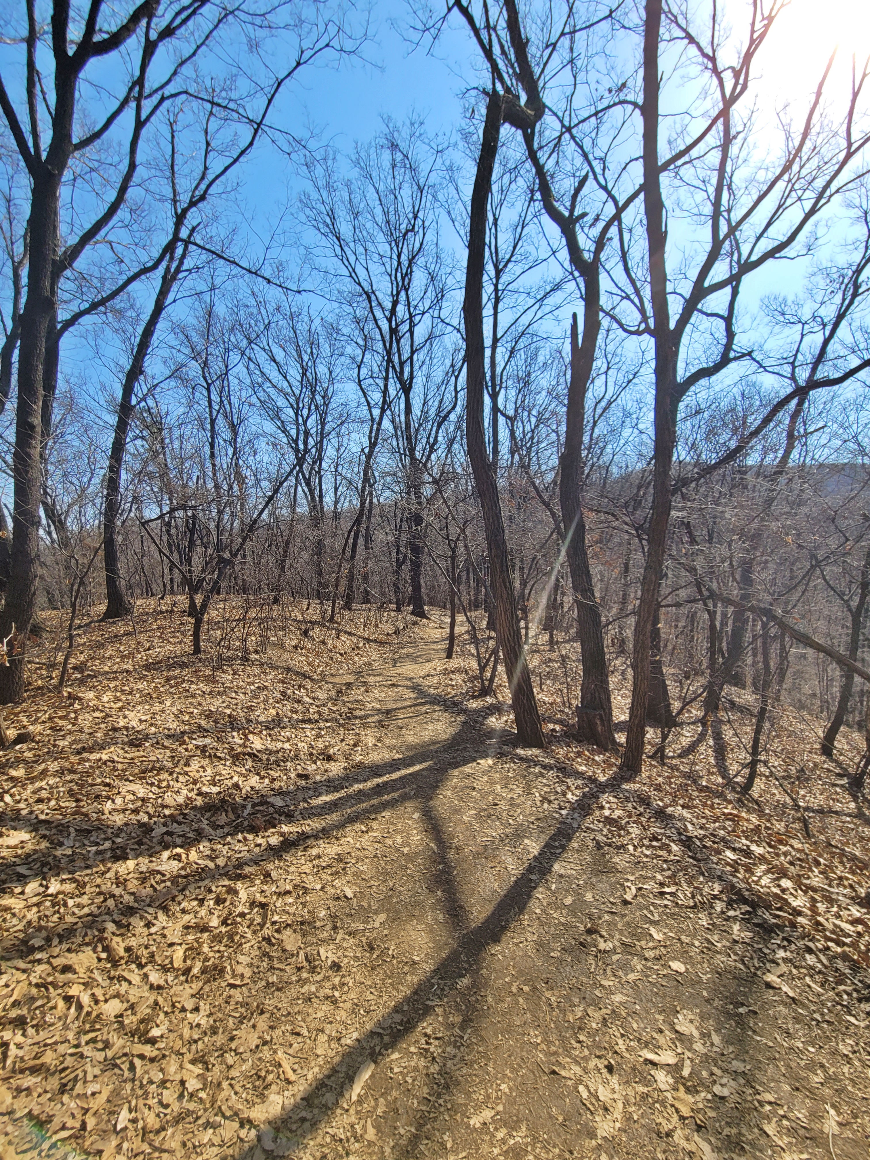 형제봉에서 불곡산 정상까지는 비교적 평탄한 길입니다. 3월 중순이라 그런지 나무들을 자세히 보니 푸릇푸릇한 기운이 올라오는 듯 보입니다. 수도권에도 햇볕이 잘 드는 곳은 벌써 개나리가 피었는데요, 이제 봄이 멀지 않았죠.