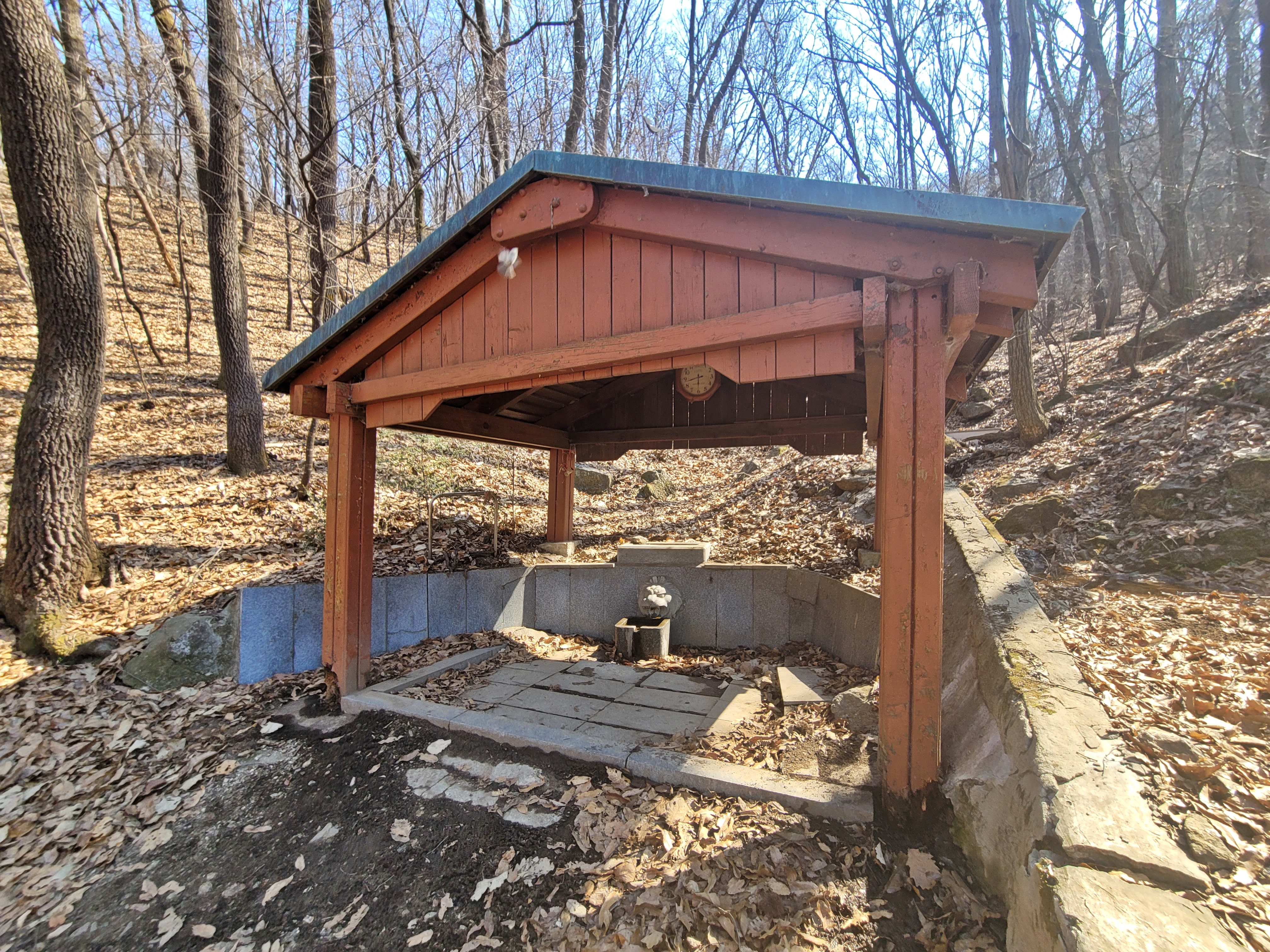 정자를 지나면 동이 약수터가 나옵니다. 불곡산 정상에서 내려오는 약수였는데요, 예전에는 인근 주민들이 약수를 떠다 마셨을 겁니다. 약수 한 모금 마시고 싶었는데, 안내판을 보니 가뭄과 오염 등으로 식수 부적합 판정을 받은 샘터입니다.