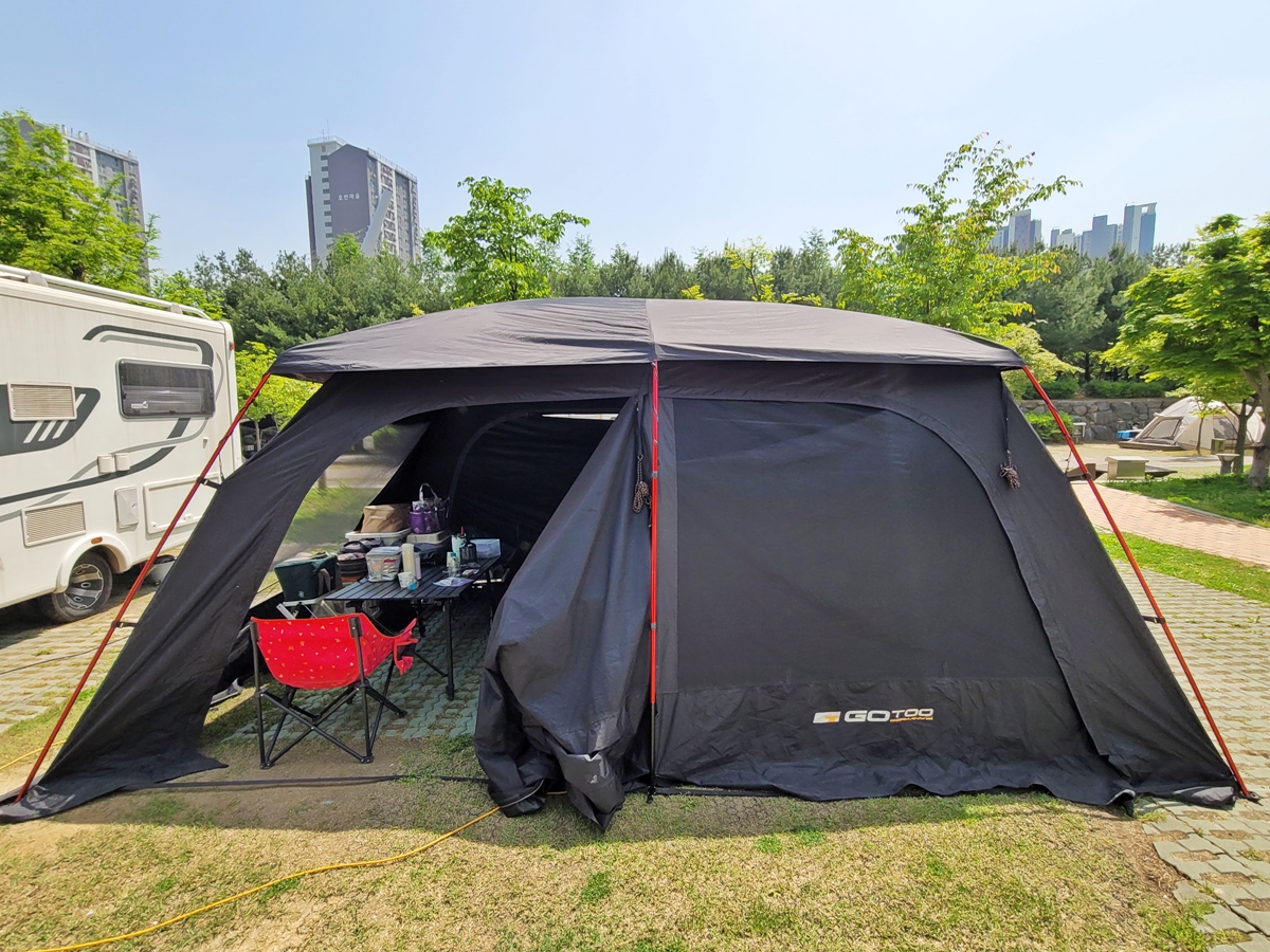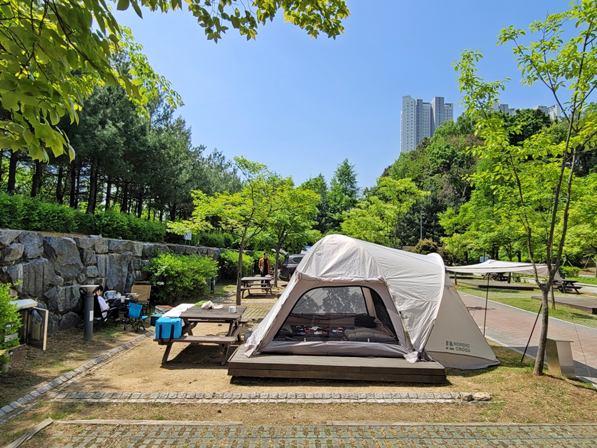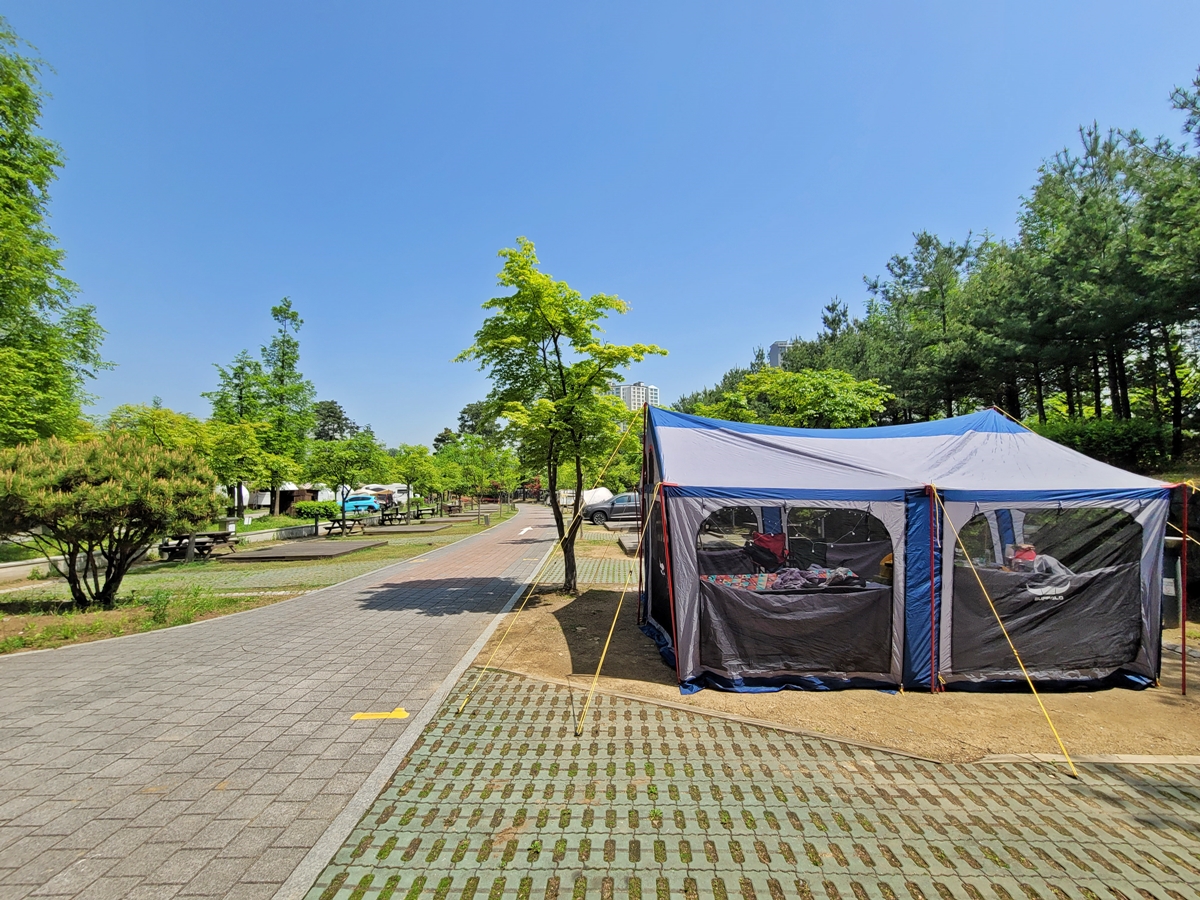 제가 관리사무소 직원 도움으로 캠핑장을 한 바퀴 돌고 난 뒤 사이트를 보니 각양각색의 텐트들이 사이트에 자리를 잡고 있습니다. 캠핑장은 사계절 가족과 함께 도심 속에서 오붓한 시간을 보낼 수 있는 레저 공간으로 손색이 없습니다.