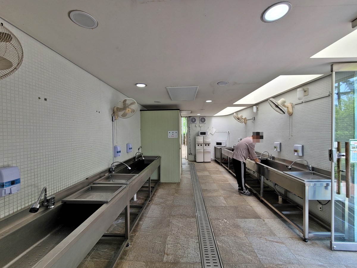 식기 세척장에 가보니 한 캠퍼가 식기를 닦고 있었습니다. 식기 세척장은 넓고도 깨끗하게 관리되고 있었는데요, 한쪽에 공용 냉장고와 나눔 냉장고(빨간색)가 있습니다. 빨간 냉장고는 캠핑장에 가져온 음식이 조금 여유가 있다면 다른 야영객들과 나눠 먹을 수 있도록 준비한 냉장고입니다. 나눔을 통해 캠퍼들 간에 정도 나눌 수 있겠네요.