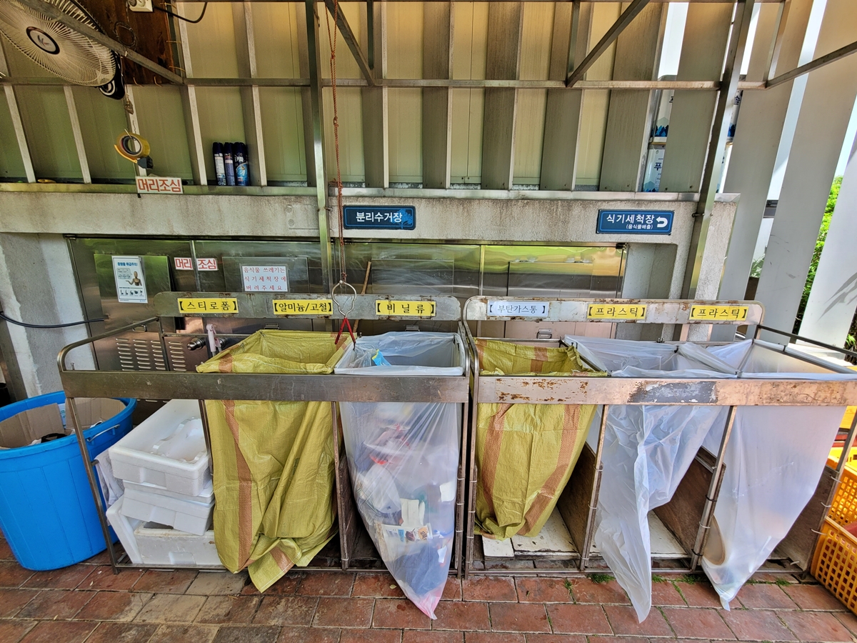 식기 세척장 옆에 분리 수거장이 있습니다. 캠핑오면 쓰레기가 많이 나오는데요, 스티로폼, 알루미늄/고철, 비닐류, 부탄가스, 플라스틱 등으로 구분해 버리게 되어 있습니다. 자연을 즐기러 캠핑을 왔으니 분리수거도 철저히 해야겠죠.
