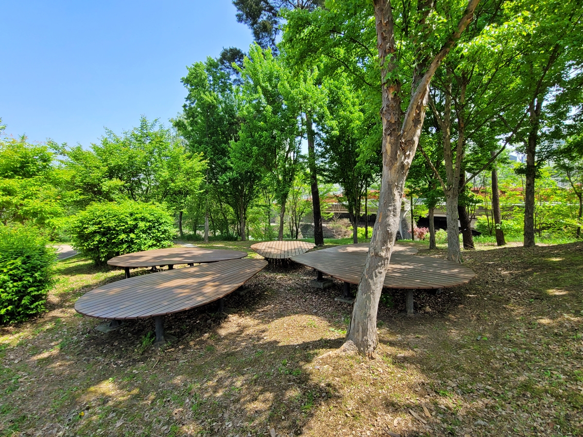 공용 공간 바로 옆에 잔디 마당(피크닉장)이 있습니다. 앙증맞은 평상도 있는데요, 시원한 나무 그늘에서 가족과 함께 즐겁고 행복하게 보낼 수 있겠네요. 피크닉장 앞에는 철쭉이 만개했는데요, 푸른 초목과 어우러져 아주 예쁘게 보입니다.