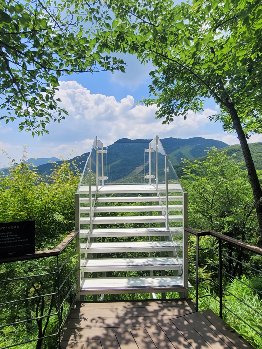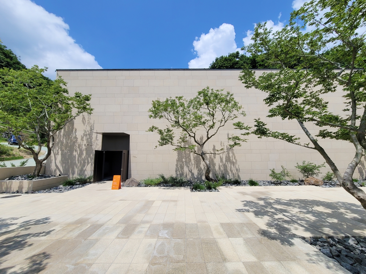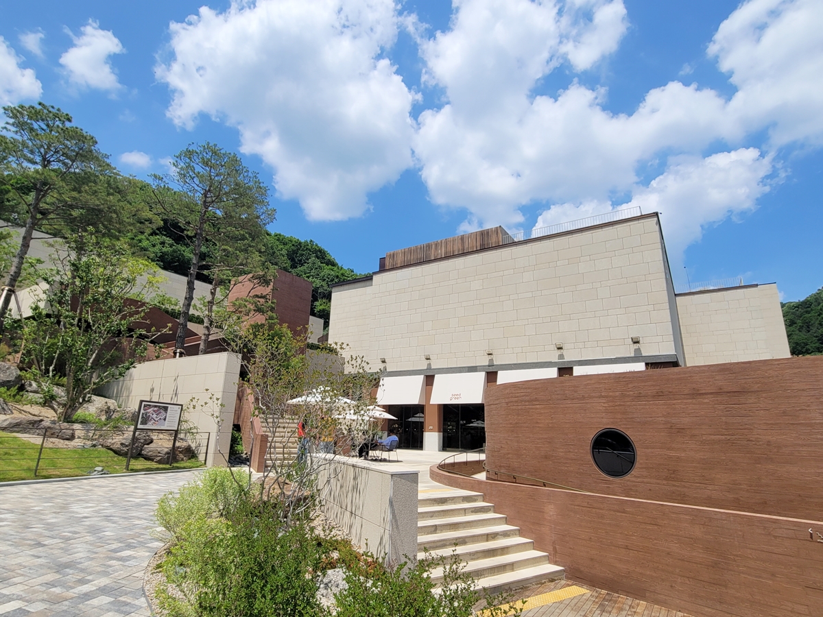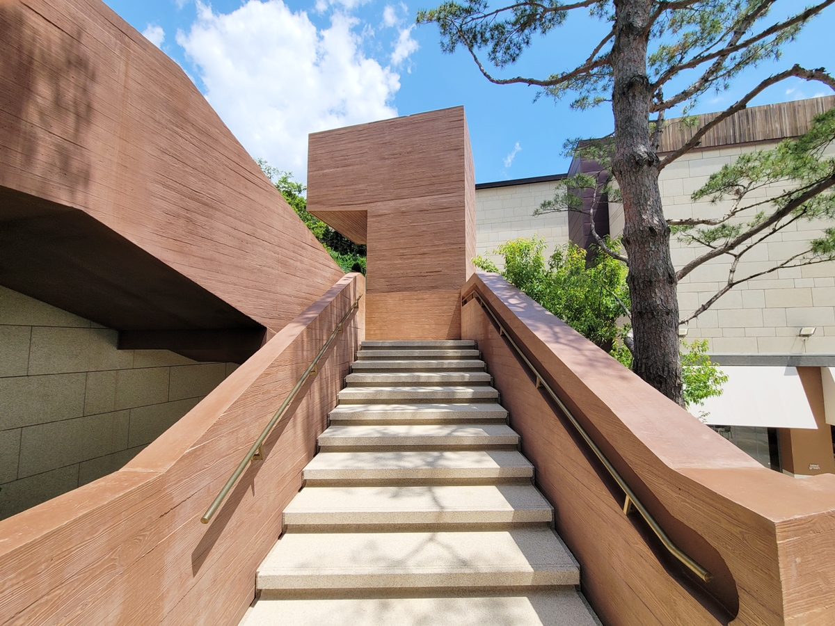 매표소를 거쳐 오브제 계단을 오릅니다. 계단은 소나무를 피해서 설치되었고, 자연과의 교감을 상징적으로 표현하고 있습니다. 현대식 건물과 소나무, 가을처럼 예쁜 하늘이 어우러져 계단을 오르는 느낌이 아주 좋았습니다. 마치 깊은 산속에 있는 별장을 오르는 기분으로요.