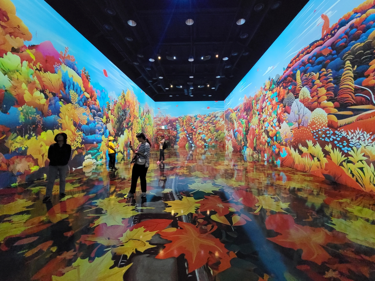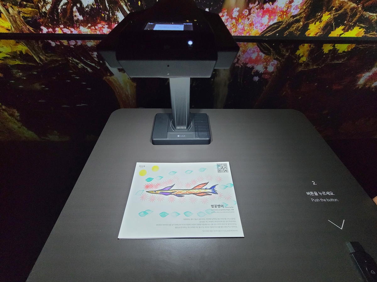 디지털 숲 <Wavy forest>는 준비된 도구로 물고기 그림을 그린 후 디지털 기기 위에 올려놓으면 내가 그린 그림이 벽 쪽 대형 화면(노란색 원)에 나옵니다. 아이들이 아주 좋아할 만한 체험입니다.