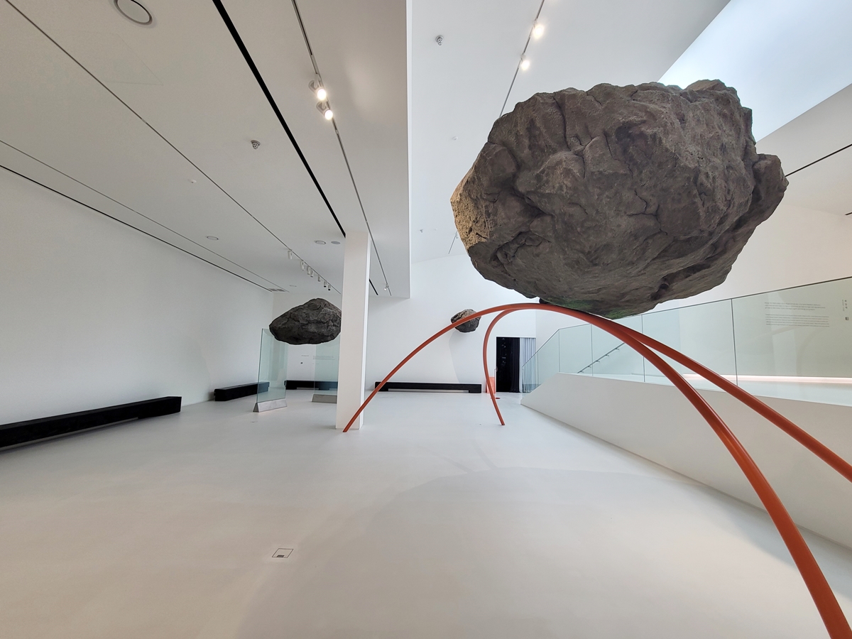이태수 작가의 <Stone composition 039>작품은 언뜻 보면 큰 바위 3개가 놓여 있는 듯이 보입니다. 벽에 있는 작품 설명을 보니 이 작품은 바위를 공중에 띄우는 역학적 모순을 보여줌으로써 대상을 바라보는 감각을 생경하게 하고 우리의 인식을 의심하게 합니다.