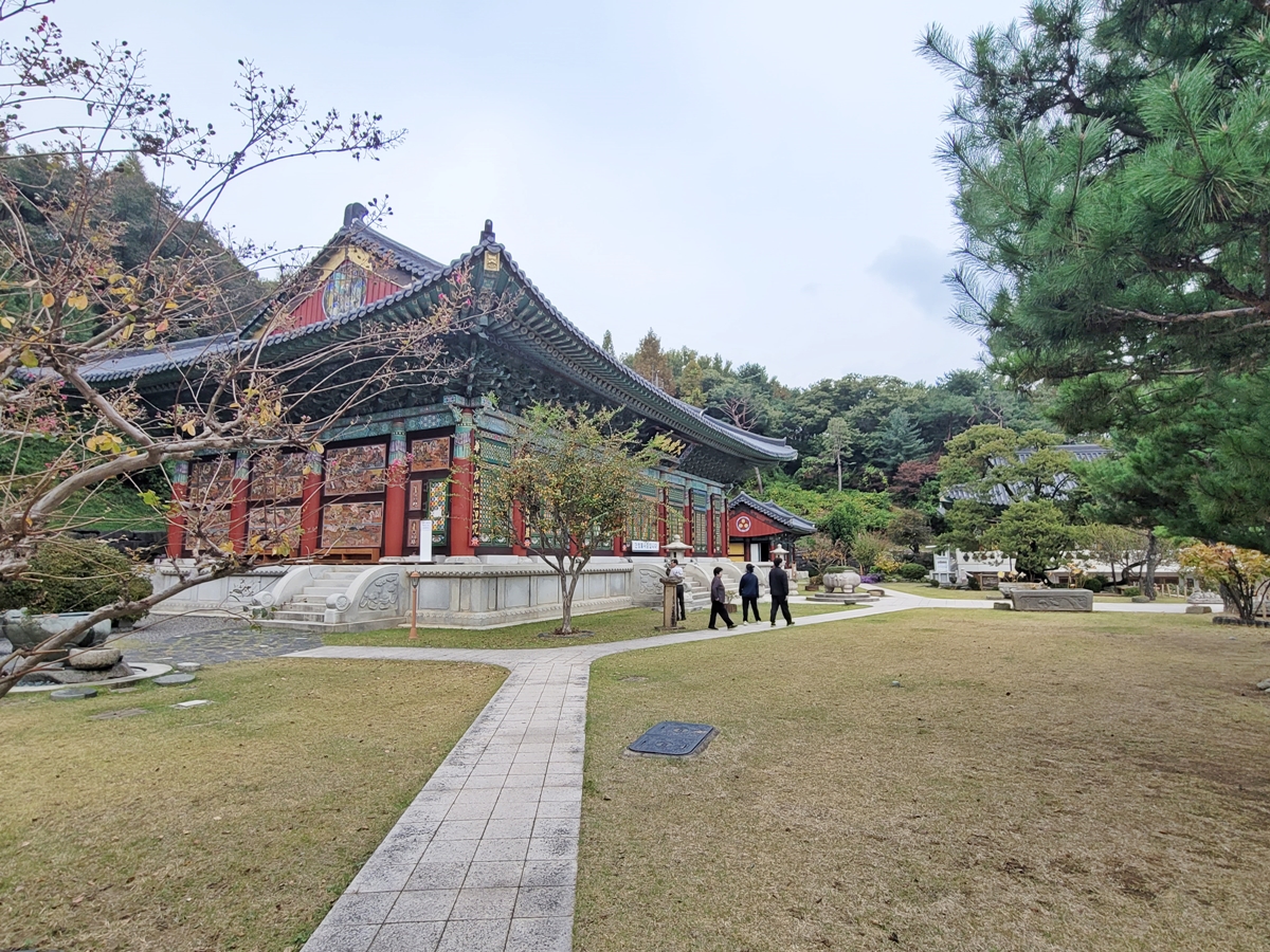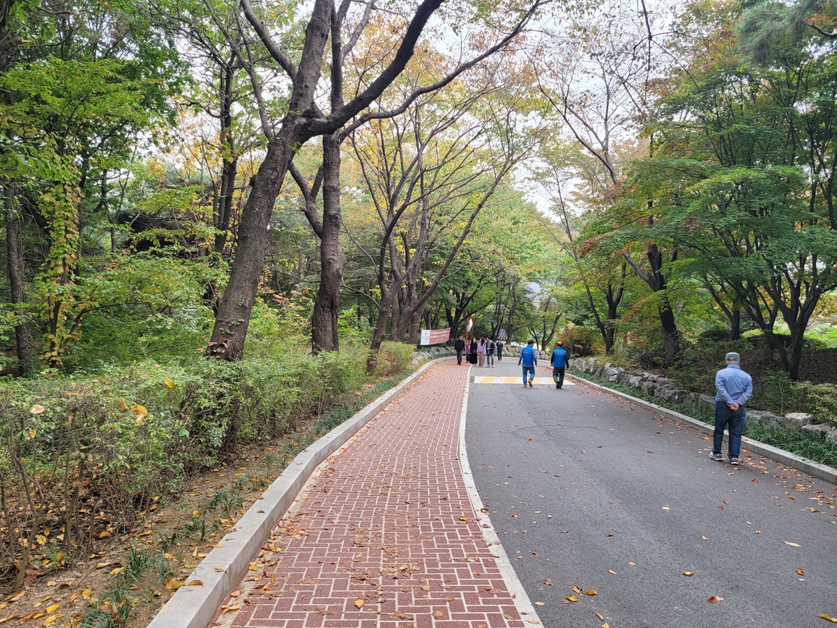 일주문을 지나면 울긋불긋한 단풍이 물들어 아름다운 가을 풍경을 보여주는 길로 들어섭니다. 도심 속 사찰인데 마치 다른 세상에 온 듯한 기분을 느끼게 합니다. 인도에 떨어진 낙엽을 밟는 소리도 가을 감성을 느끼게 하네요.