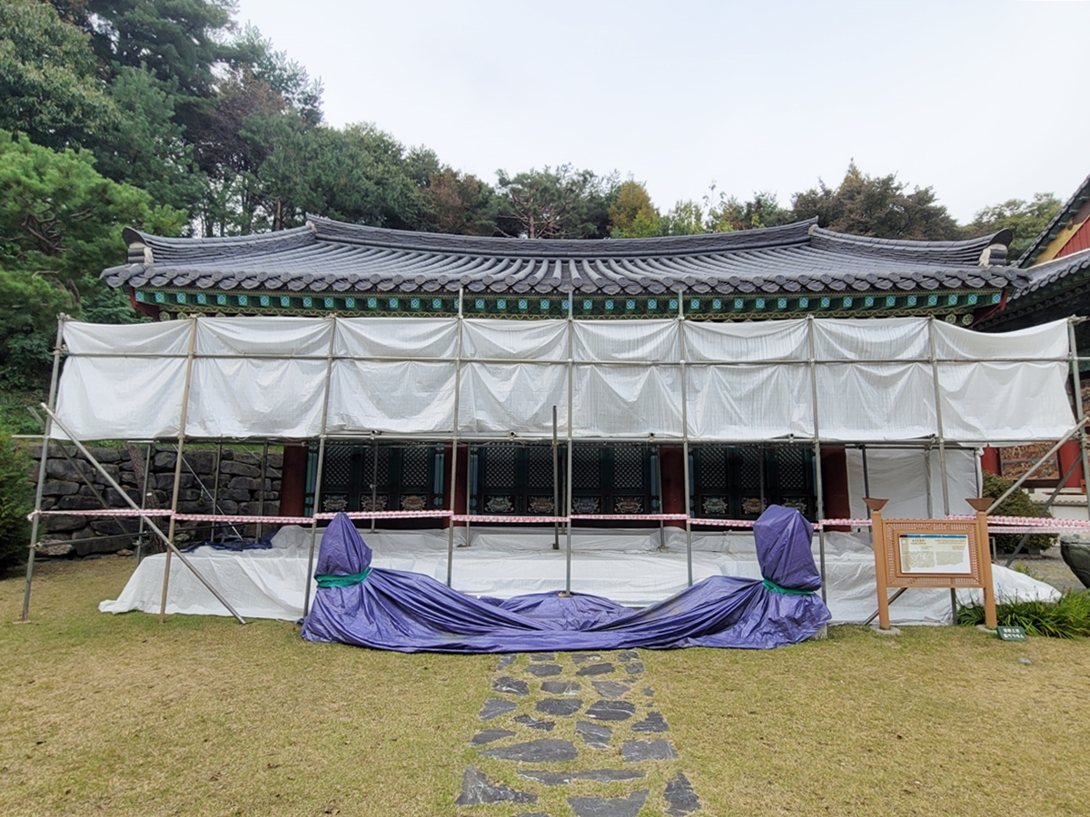 대적광전 옆에 있는 약사보전입니다. 단청 공사를 하느라 가림막이 설치되어 있습니다. 단청 공사는 오래된 사찰에서 주기적으로 진행되며, 보통 10~20년을 주기로 색이 바래거나 벗겨진 곳을 복원하는 방식으로 진행됩니다. 공사 기간을 보니 2024년 9월 10일부터 12월 27일까지인데요, 더 아름다운 모습으로 변할 것입니다.