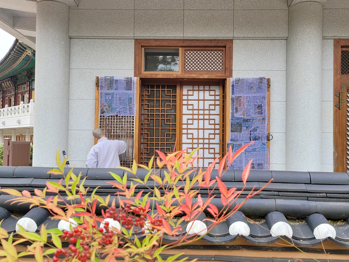 약사보전 아래 청운당입니다. 비구니 스님 한 분이 겨울 채비를 하고 있네요. 겨울에 바람이 들어오지 않도록 문틀에 종이를 바르고 있는데요, 이런 모습 참 오랜만에 봅니다. 청운당 담장 앞에 웬 열매 나무가 있는데, 무슨 나무일까요?
