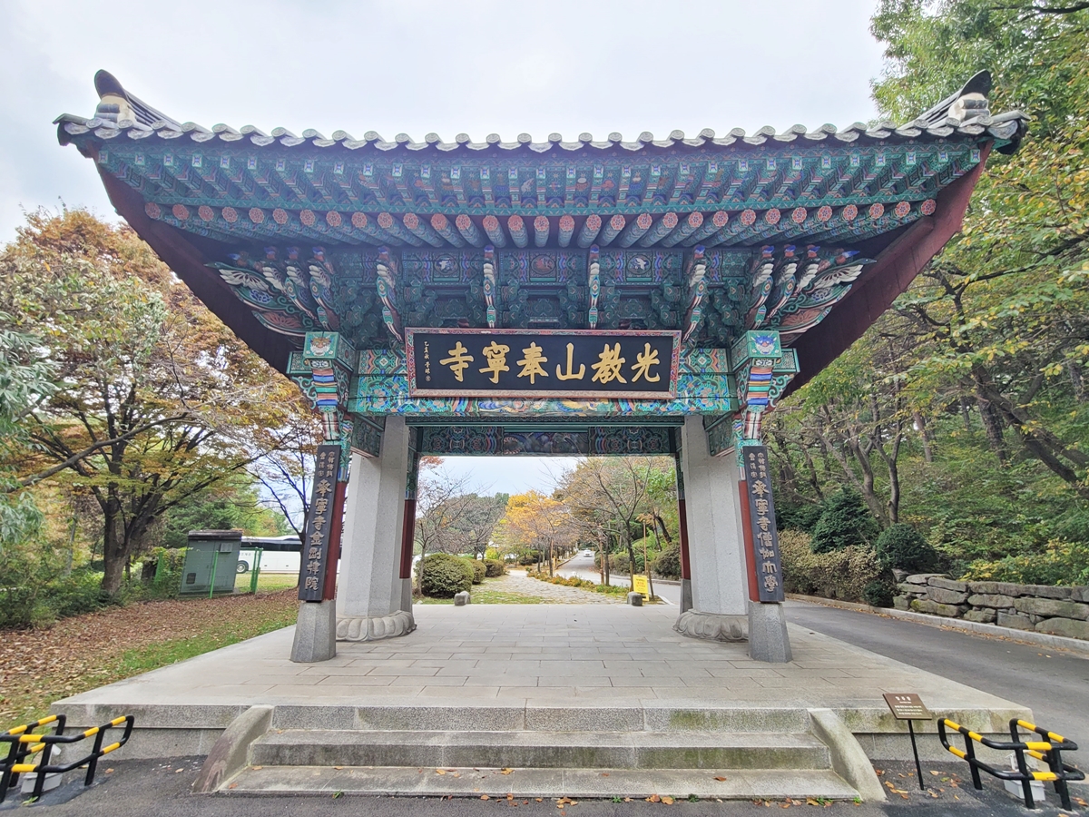 봉녕사에서 가장 먼저 반겨주는 전각은 일주문입니다. 일주문(一柱門)은 사찰 입구에 세워진 문으로 사찰 경내로 들어가는 첫 번째 관문입니다. 일주문을 지나면 속세의 번잡함을 뒤로하고 사찰의 고요하고 신성한 공간으로 들어간다는 의미를 담고 있습니다. 일주문에는 한문으로 ‘光敎山奉寧寺’(광교산봉녕사)라고 적혀 있습니다.