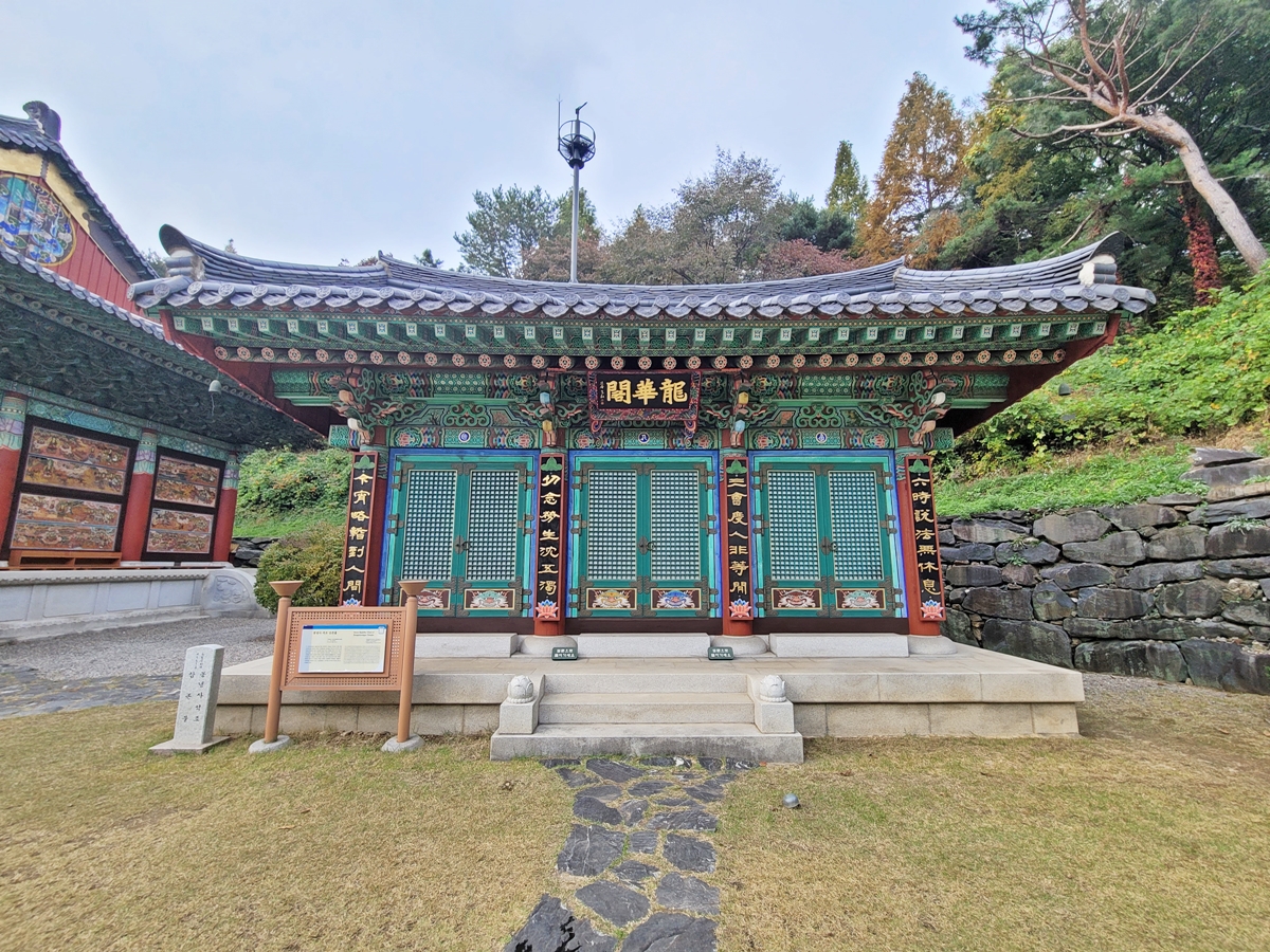대적광전 오른쪽에 용화각이 있습니다. 안내판을 보니 내부에는 석조여래좌상 1구와 석조보살입상 2구가 봉안되어 있는데, 고려시대의 불상으로 현재 경기도 유형문화재 제151호로 지정되어 있습니다. 용화각도 많은 불자가 기도하고 있었습니다.