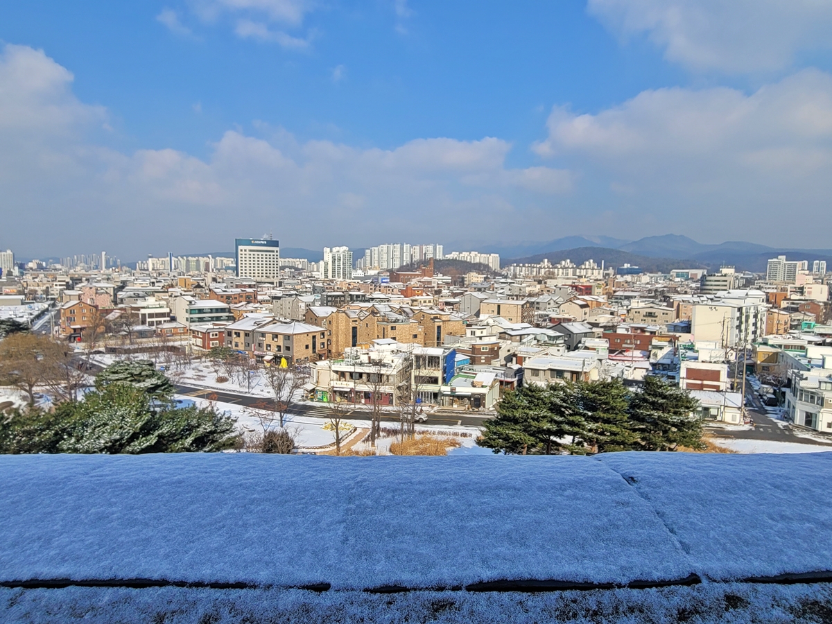 각건대에서 방화수류정과 용연이 한눈에 내려다보입니다. 그리고 매향동 일대도 보입니다. 수원에서 멋진 설경을 볼 수 있는 곳 중의 하나가 각건대입니다. 날씨가 흐렸었는데, 제가 각건대에 올라가니 맑아져 더 선명하게 보입니다.
