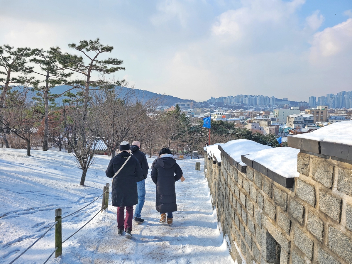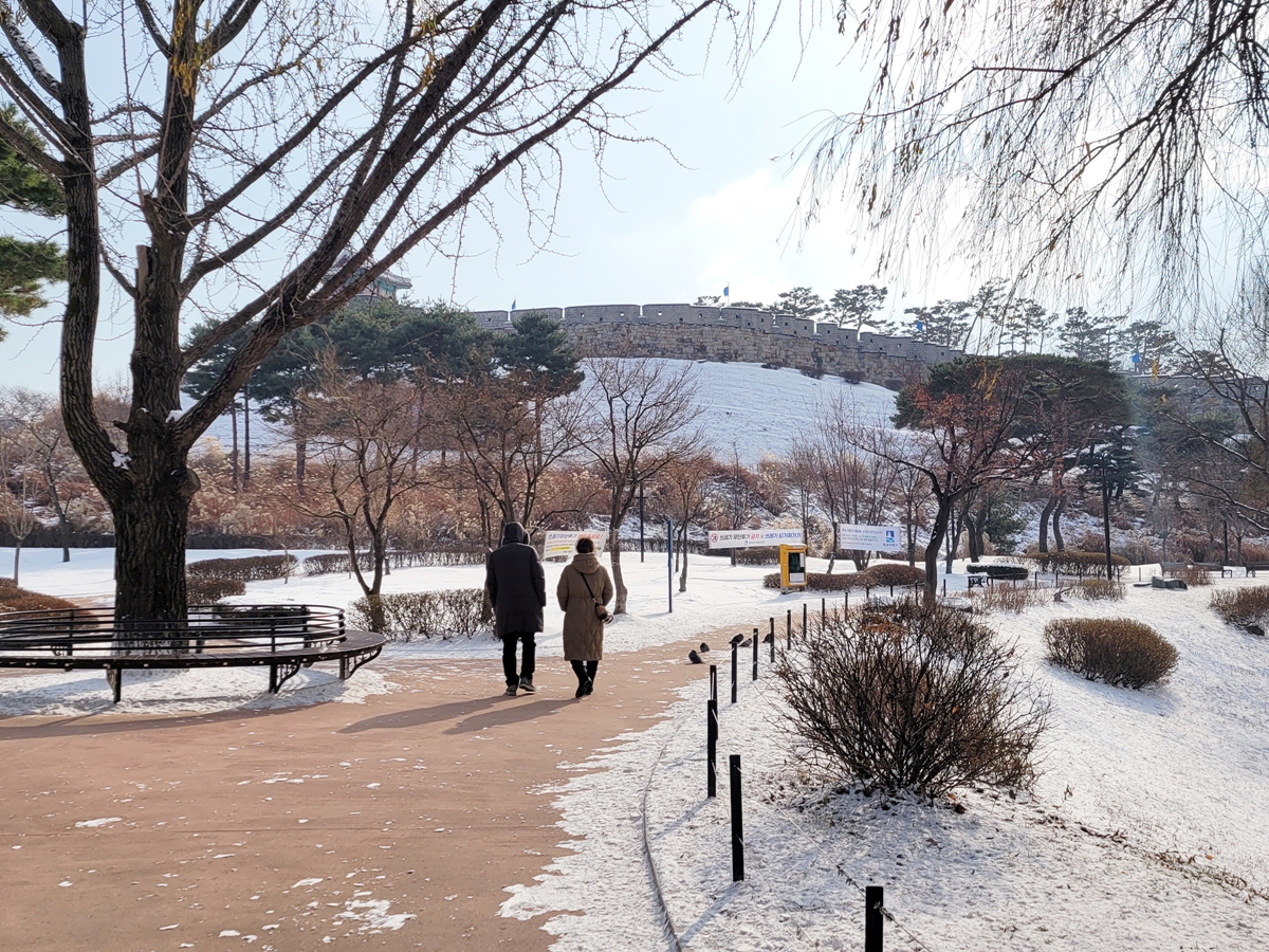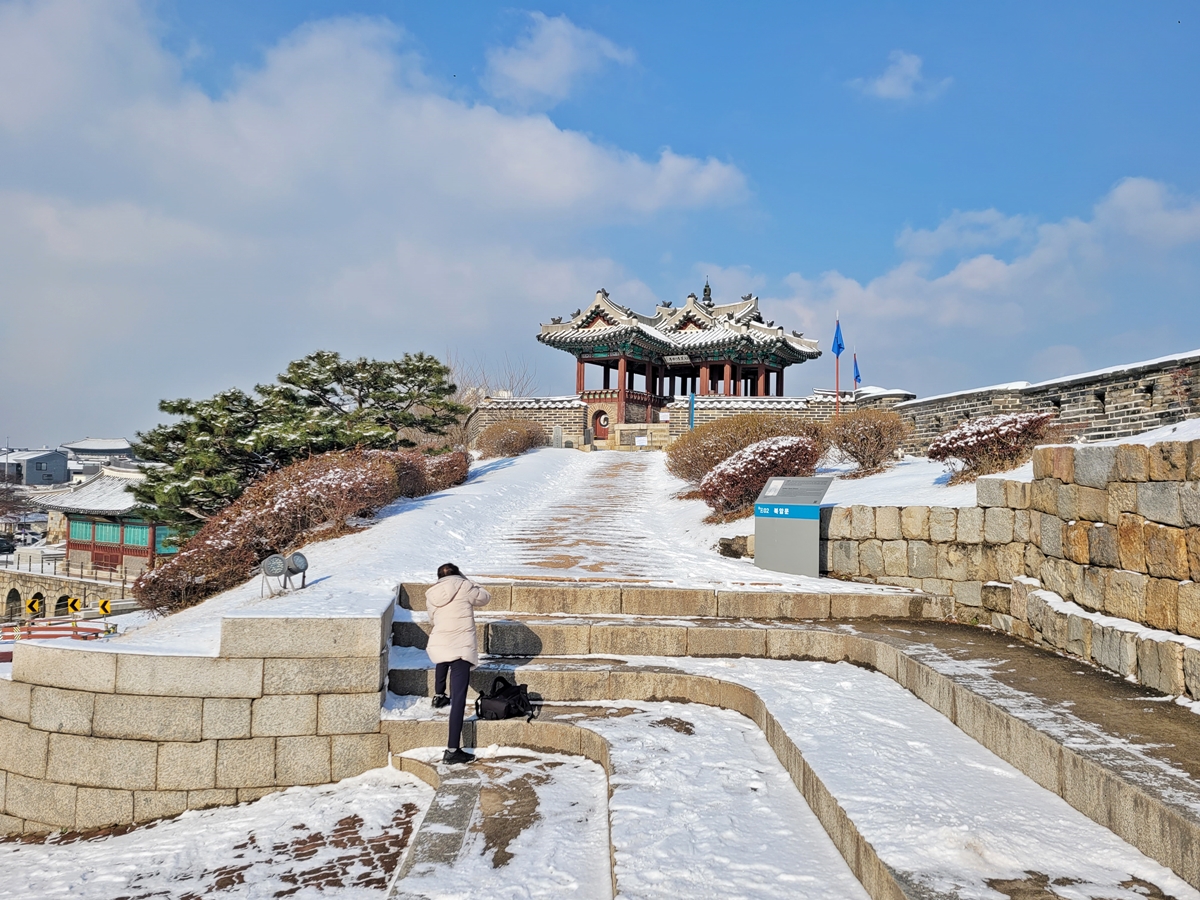 방화수류정에서 나와 각건대 쪽으로 올라가 봅니다. 간밤에 눈이 내리고 영하의 기온이라 계단이 미끄러워 조심조심 올라갔습니다. 많은 시민이 영하의 날씨에도 눈으로 뒤덮인 성곽의 설경을 보러 왔습니다.