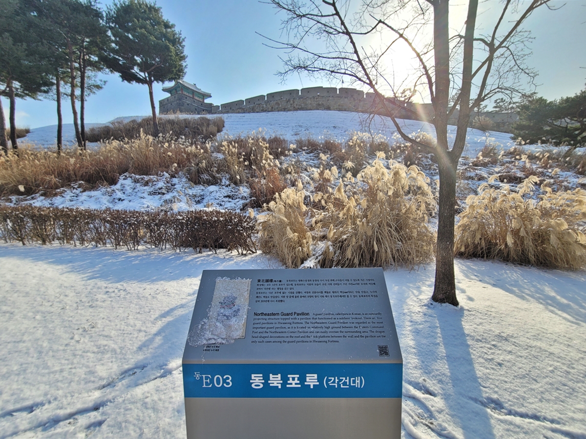 용연에서 위를 보니 동북포루가 손에 잡힐 듯 가깝게 보입니다. 방화수류정 문화재는 안내판이 너무 잘 되어 있어서 조선 시대 화성의 역사를 잘 알려주고 있습니다. 동북포루(각건대)는 방화수류정과 동장대 사이 군사들이 머물 수 있도록 지은 시설입니다.