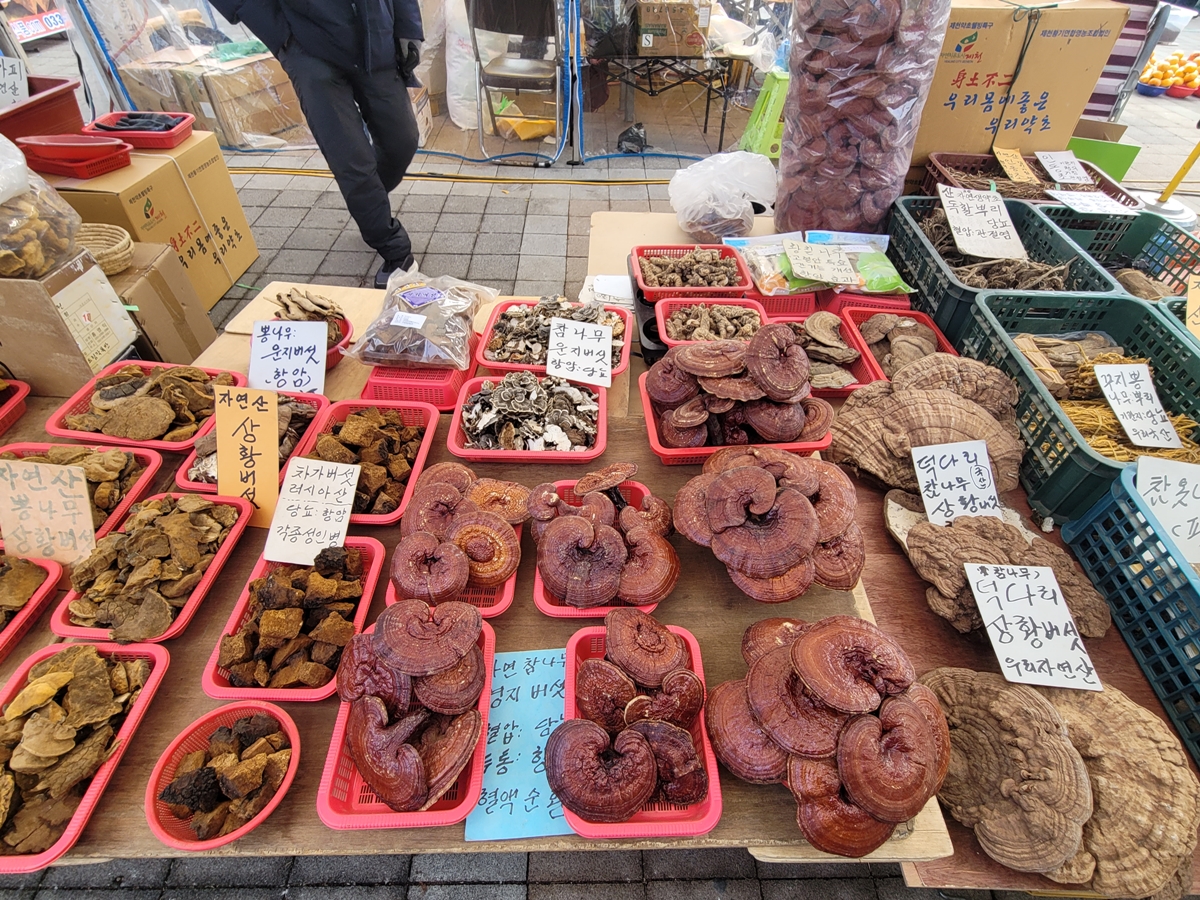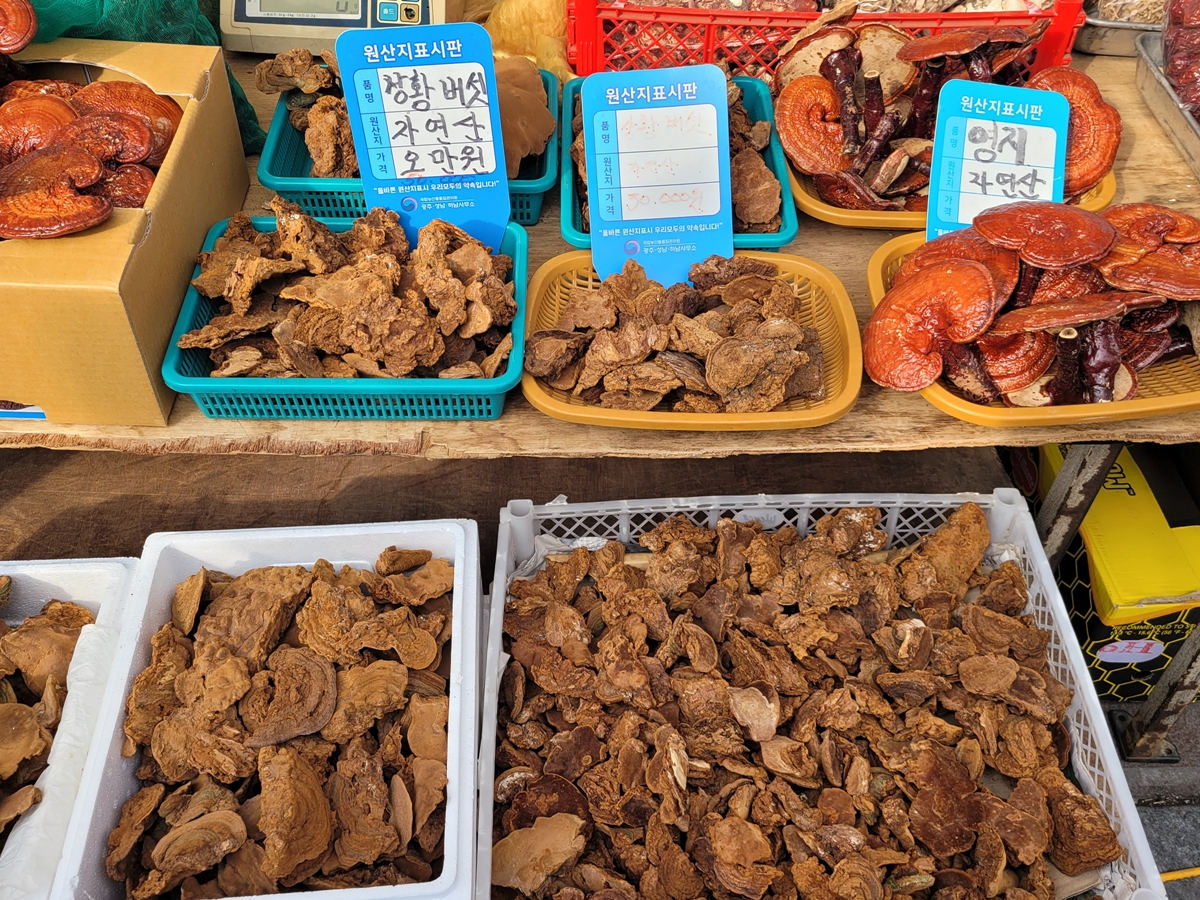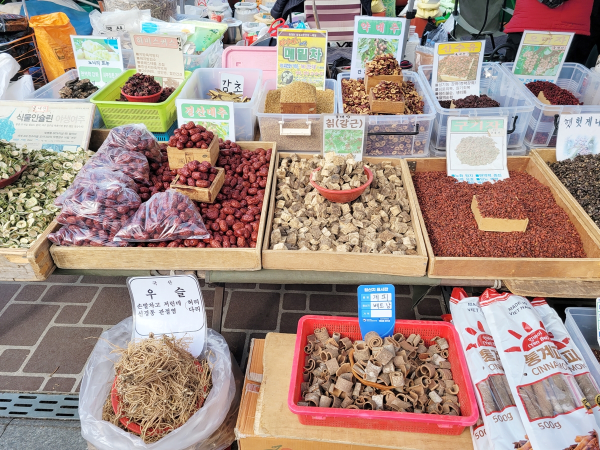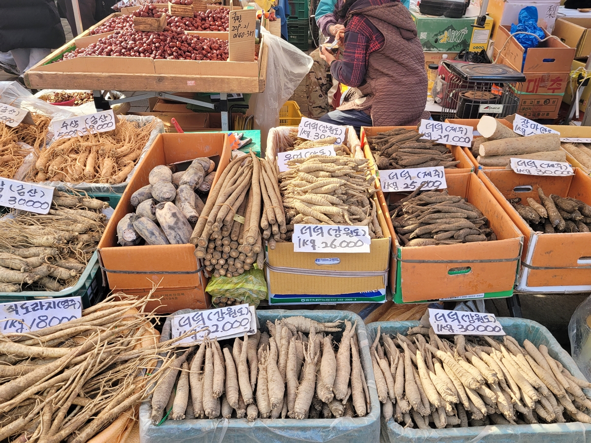 장터에 구수한 냄새가 나서 보니 둥굴레를 판매하고 있습니다. 둥굴레차는 둥굴레 뿌리줄기를 말려 만든 차로, 예로부터 한방에서 약재로 사용되어 온 둥굴레는 다양한 건강 효능을 지녔다고 합니다. 겨울에 커피 대신 따뜻한 둥굴레차를 마시면 건강에도 좋겠죠.