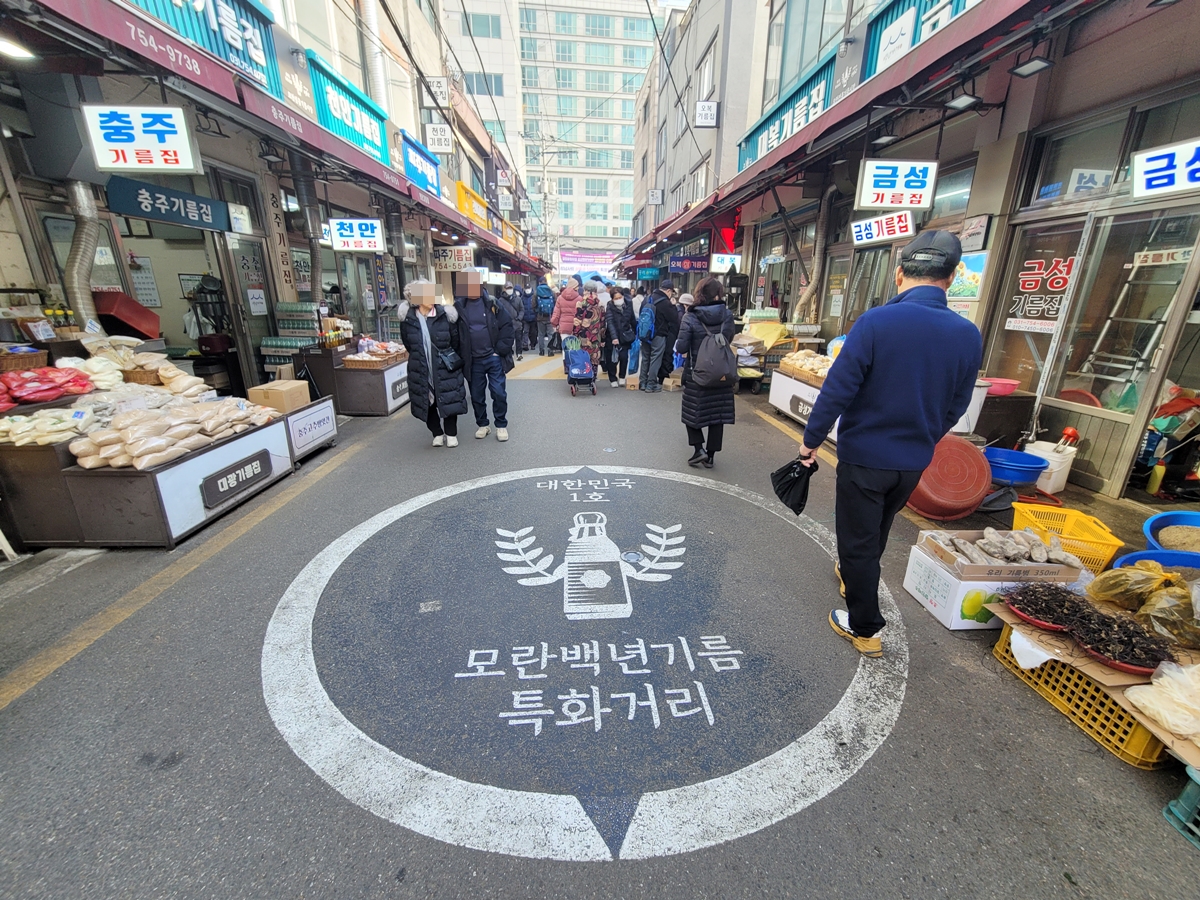 모란시장 안에 대한민국 1호 모란 백년 기름 특화거리가 있습니다. 기름 특화거리로 들어서니 고소한 냄새가 코를 찌릅니다. 이곳에서는 40여 개 가게에서 기름을 직접 짜서 판매합니다. 설날 선물로 인기가 많은 국내산 참기름, 들기름을 사러 많은 사람이 방문했습니다.