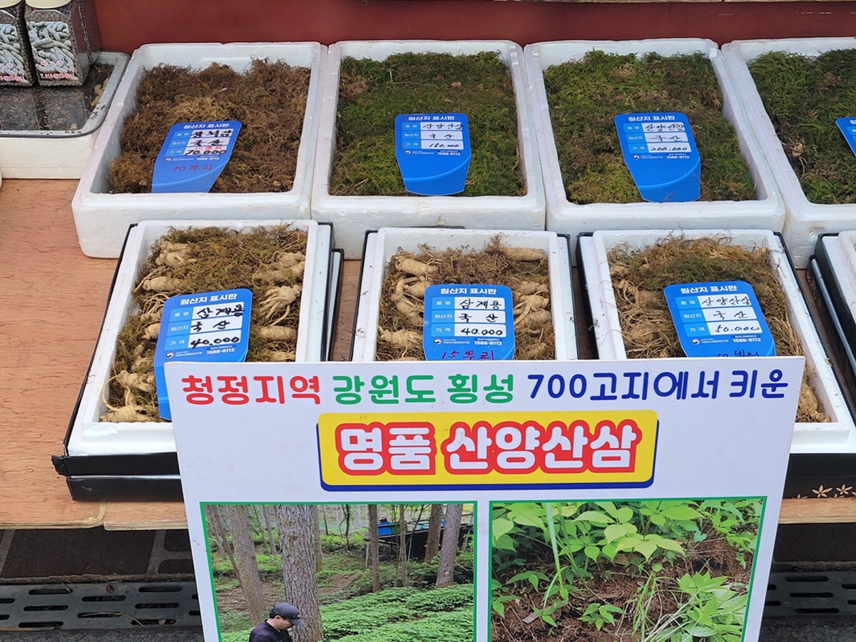 모란시장에서는 산양삼도 판매하고 있는데요, 산양삼은 인공적으로 재배되는 장뇌삼(재배삼)과 달리, 자연의 환경에서 자생하도록 관리하는 방식으로 재배됩니다. 산양삼은 일반적으로 인삼 종자를 산지에 심고, 화학비료나 농약을 사용하지 않아 건강에 아주 좋습니다.