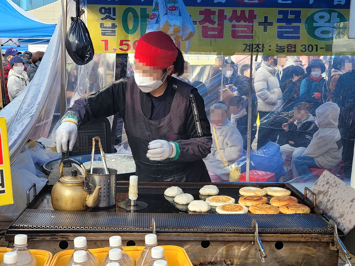 장날의 별미 호떡도 빼놓을 수 없죠. '호떡집에 불났다'라는 말처럼 호떡 하나를 먹기 위해 긴 줄도 마다하지 않는 장날 맛집입니다. 저도 아내와 함께 줄을 서서 호떡 하나씩 사 먹었는데, 그 옛날 아버지 손을 잡고 가서 먹던 그 맛이었습니다.