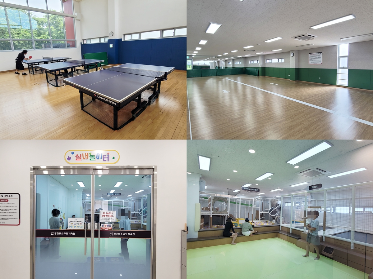 1층은 실내 놀이터, 사무실, 고객대기실이 있고, 2층은 어린이(유아) 인라인스케이트장, 3층은 스크린 파크골프장과 탁구장이 있습니다. 이용 시간은 평일(화~금)은 09:00~21:00, 주말(토~일요일)은 09:00~18:00까지입니다. 매주 월요일은 휴관입니다.