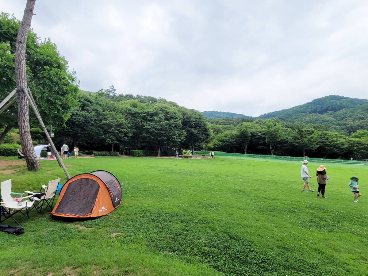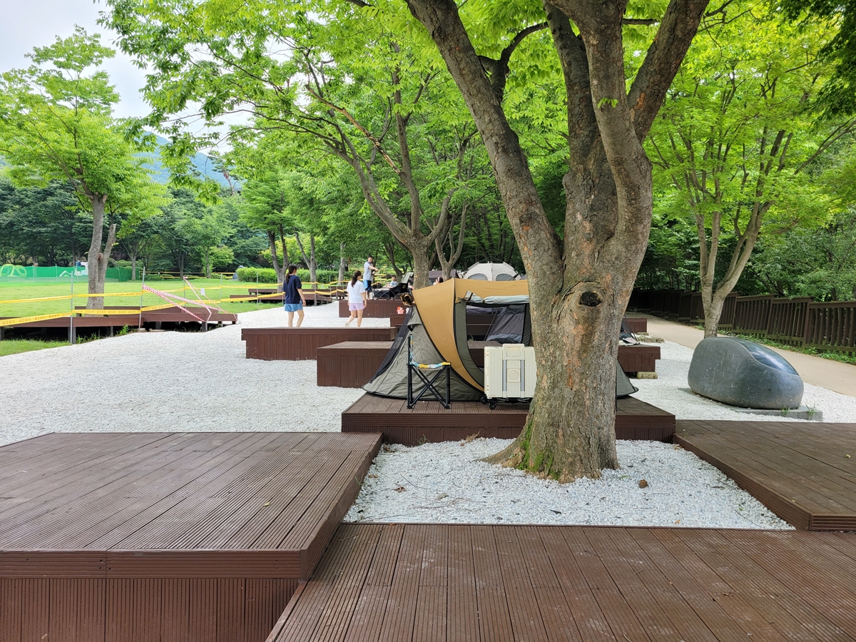 야영장 예약이 쉽지 않은 점을 고려 잔디 마당에 그늘막 설치를 허용했습니다. 당일에 와서 그늘막을 치고 가족들과 캠핑 분위기를 내며 쉴 수 있는데, 이곳은 취사 금지입니다. 간식과 음료 등을 싸와서 피크닉처럼 즐기는 공간입니다.