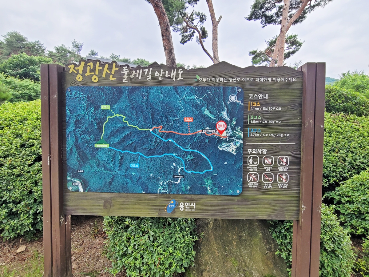 치유의 숲길은 짧은데요, 휴양림에서 정광산 정상까지 올라갈 수 있습니다. 코스에 따라 다른데요, 1, 2코스는 30분, 3코스는 1시간 20분 소요됩니다. 정광산 정상에서 올라가 내려다보면 용인자연휴양림이 한눈에 들어옵니다.