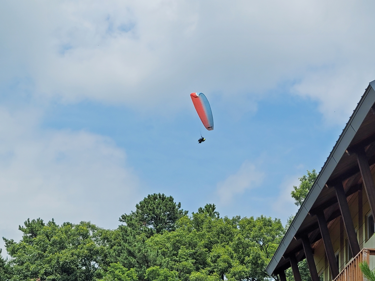 목재문화체험관을 나오니 하늘에서 패러글라이딩이 날고 있습니다. 휴양림이 있는 정광산 위에 패러글라이딩장이 있어서 휴양림 위로 지나갑니다. 푸른 하늘을 새처럼 날아가며 대자연의 웅장함을 눈으로 확인할 수 있고, 짜릿한 스릴도 맛볼 수 있죠. 4세에서 80세까지 이용할 수 있고, 이용료는 기본 코스 기준으로 10만 원입니다.