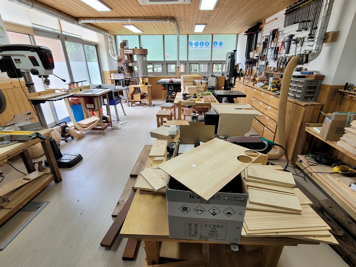 목공예실은 목공 작품을 만들기 위한 재료와 기구 등이 가득합니다. 내가 만들고 싶은 책꽂이, 도마, 나무 접시, 모니터 받침대, 공간 박스, 시계 등을 만들 수 있습니다. 이곳은 아이들보다 중학생 이상이 체험하는 곳입니다.