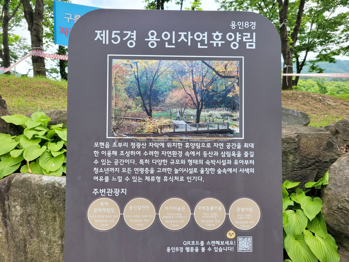 용인시에 8경이 있는데, 그중 용인자연휴양림은 제5경이네요. 용인시 모현읍 초부리 정광산 자락에 있어서 수려한 산림 환경이 있어 등산과 산림욕을 즐길 수 있는 곳입니다. 주변 관광지에 목재문화체험관이 있는데, 먼저 가보겠습니다.